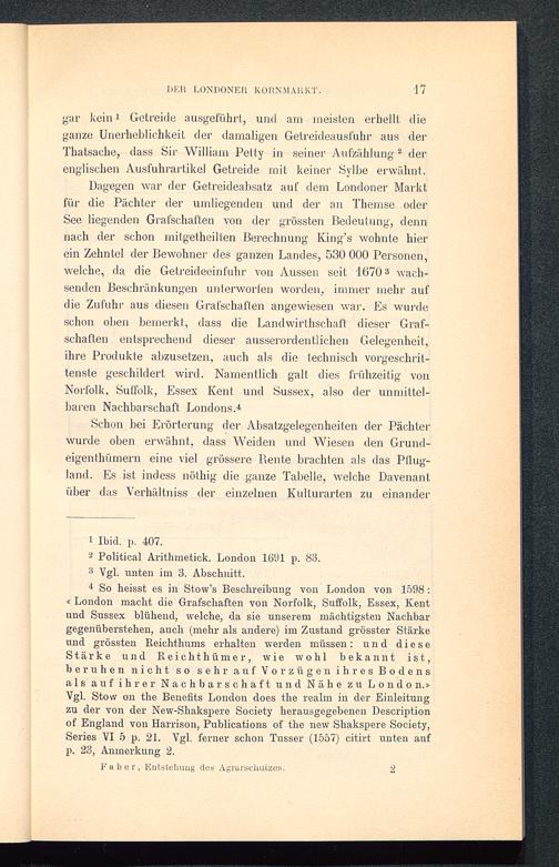 4 So heisst es in Stow’s Beschreibung von London von 1598:« London macht die Grafschaften von Norfolk , Suffolk, Essex, Kentund Sussex blühend, welche, da sie unserem mächtigsten Nachbargegenüberstehen, auch (mehr als andere) im Zustand grösster Stärkeund grössten Reichthums erhalten werden müssen: und dieseStärke und Reicht hümer, wie wohl bekannt ist,beruhen nicht so sehr auf Vorzügen ihres Bodensals auf ihrer Nachbarschaft und Nähe zu London .»Vgl. Stow on the Benefits London does tlie realm in der Einleitungzu der von der New-Shakspere Society herausgegebenen Descriptionof England von Harrison, Publications of the new Shakspere Society,Series VI 5 p. 21. Vgl. ferner schon Tusser (1557) citirt unten aufp. 23, Anmerkung 2.