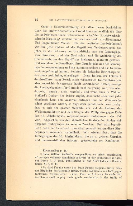 Ganz in Uebereinstimmung mit allen diesen Nachrichtenüber die landwirlhschaftliche Produktion sind endlich die überdie landwirtschaftliche Betriebsweise. «Auf den Fruchtwechsel»,schreibt Macaulay, 1 verstand man sich noch sehr unvollkommen.»Und begreiflicher Weise. Für die englische Landwirthschaftwie für jede andere ist der Begriff von Verbesserungen vonjeher an die Befreiung der Grundstücke aus der Gemenglage,vom Flurzwang und der Nachweide, und die Aufteilung desGemeinlands, an den Begriff der inclosures, geknüpft gewesen.Erst nachdem die Grundherrn ihre Grundstücke aus der Gemeng-lage herausgenommen und sie zusammengelegt und das Gemein-land eingefriedigt hatten, konnten sie jedwedes Betriebssystem,das ihnen gutdünkte, einsclilagen. Diese Beform der Feldmarkdurchzuführen zum Zweck eines verbesserten Getreidebaus waraber angesichts der grossen damit verbundenen Kosten, solangedie Absatzgelegenheit für Getreide noch so gering war, wie obendargelegt wurde, nicht rentabel, und wenn auch in WilliamStafford’s Dialog 2 der Doktor zugibt, dass nicht alles und jedeseingehegte Land dem Ackerbau entzogen und der Weidewirt-schaft gewidmet wurde, so zeigt doch gerade auch dieser Dialog,dass es mit der grossen Mehrzahl der seit der Hebung derWollenmanufaktur und dem Steigen der Wollpreise gegen Endedes 15. Jahrhunderts vorgenommenen Einhegungen der Fallwar. Abgesehen von den südöstlichen Grafschaften finden sichnirgends Einhegungen zu anderen Zwecken. Und ganz begreif-lich : denn der Schafzucht dienstbar gemacht waren diese Ein-hegungen ungemein vorteilhaft. Wir wissen aber, dass dieEinhegungen des 16. Jahrhunderts, die zu so grossen Unruhenund Bauernaufständen führten, grösstenteils von Kaufleuten, 3