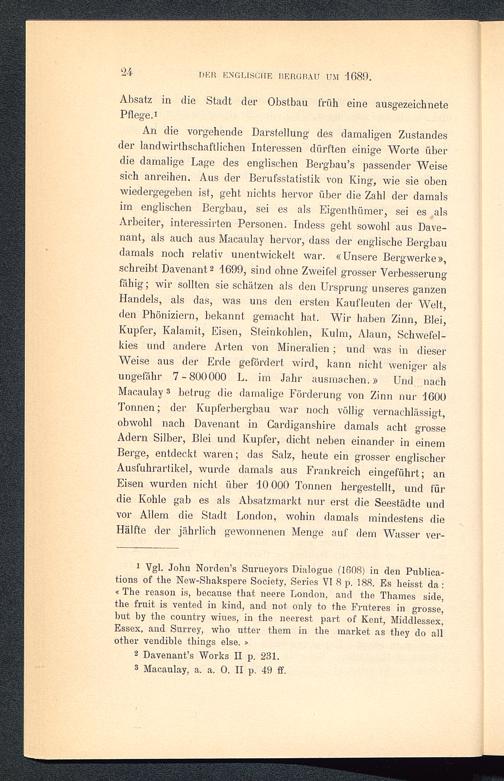 An die vorgehende Darstellung des damaligen Zustandesder landwirtschaftlichen Interessen dürften einige Worte überdie damalige Lage des englischen Bergbau’s passender Weisesich anreihen. Aus der Berufsstatistik von King, wie sie obenwiedergegeben ist, geht nichts hervor über die Zahl der damalsim englischen Bergbau, sei es als Eigentümer, sei es alsArbeiter, int.eressirten Personen. Indess gehl sowohl aus Dave-nant, als auch aus Macaulay hervor, dass der englische Bergbaudamals noch relativ unentwickelt war. «Unsere Bergwerke»,schreibt Davenant 2 1699, sind ohne Zweifel grosser Verbesserungfähig; wir sollten sie schätzen als den Ursprung unseres ganzenHandels, als das, was uns den ersten Kaufleuten der Welt,den Phöniziern, bekannt gemacht hat. Wir haben Zinn, Blei,Kupfer, Kalamit, Eisen, Steinkohlen, Kulm, Alaun, Schwefel-kies und andere Arten von Mineralien; und was in dieserWeise aus der Erde gefördert wird, kann nicht weniger alsungefähr 7-800000 L. im Jahr ausmachen.» Und nachMacaulay 3 betrug die damalige Förderung von Zinn nur 1600Tonnen; der Kupferbergbau war noch völlig vernachlässigt,obwohl nach Davenant in Cardiganshire damals acht grosseAdern Silber, Blei und Kupfer, dicht neben einander in einemBerge, entdeckt waren; das Salz, heute ein grosser englischerAusfuhrartikel, wurde damals aus Frankreich eingeführt; anEisen wurden nicht über 10 000 Tonnen hergestellt, und fürdie Kohle gab es als Absatzmarkt nur erst die Seestädte undvor Allem die Stadt London, wohin damals mindestens dieHälfte der jährlich gewonnenen Menge auf dem Wasser ver-