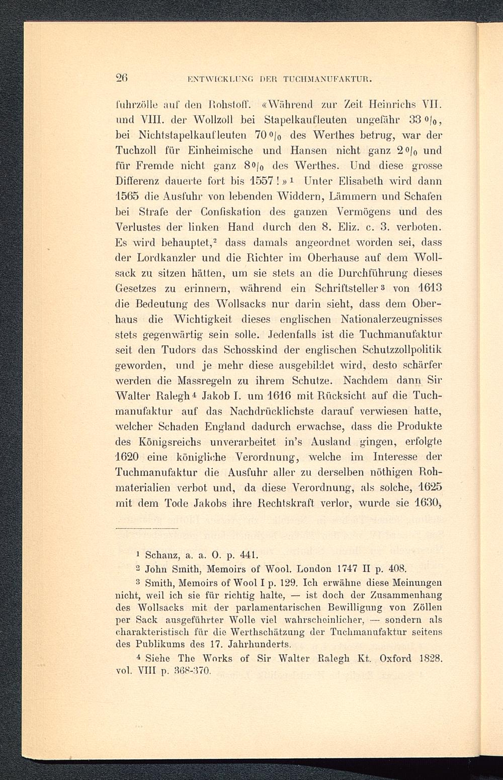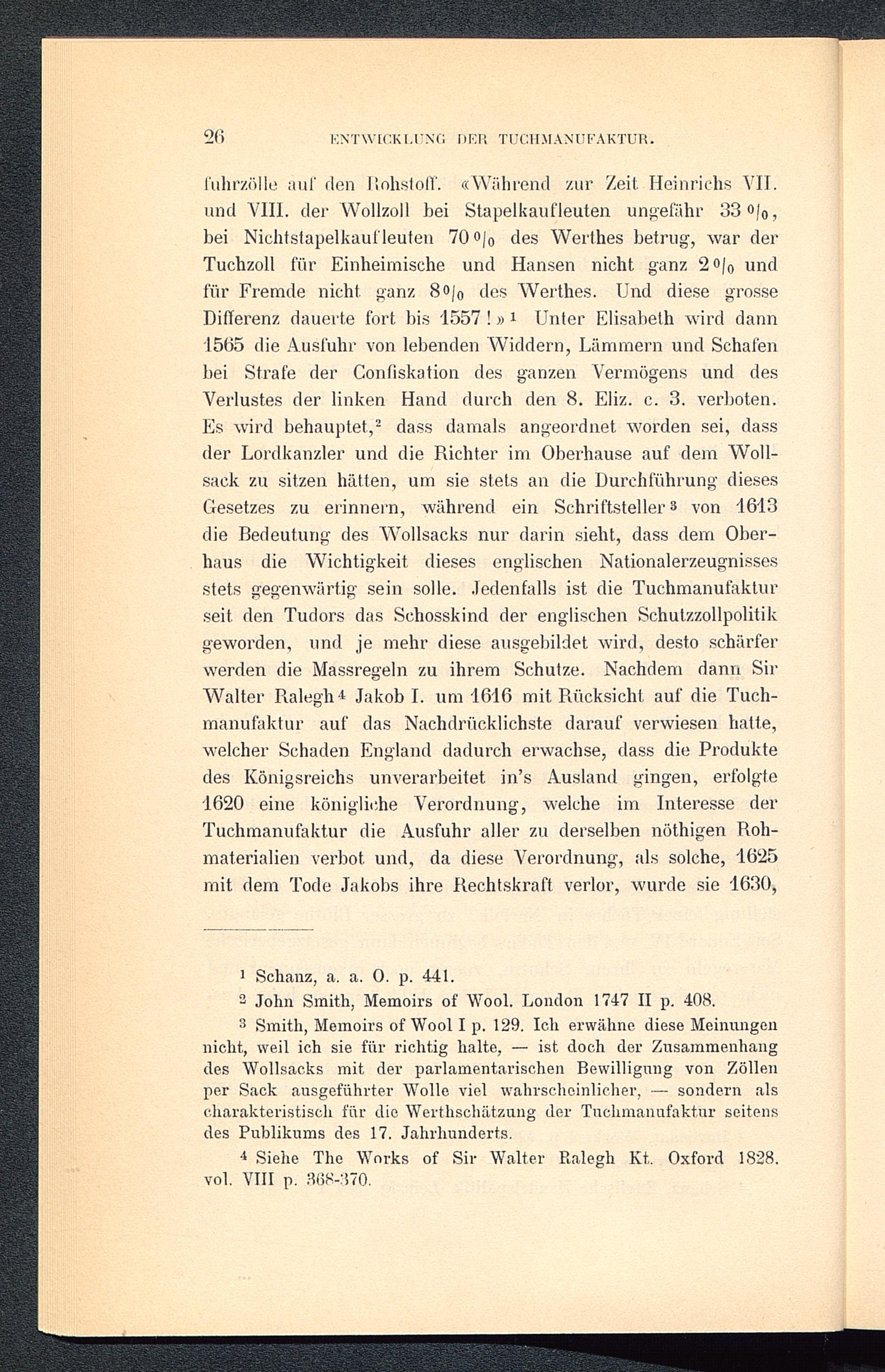 fuhrzölle auf den Ilohstoll'. «Während zur Zeit. Heinrichs VII. und VIII. der Wollzoll bei Stapelkaufleuten ungefähr 33 °/o ?bei Nichtstapelkauf leuten 70 oj 0 des Werthes betrug, war derTuchzoll für Einheimische und Hansen nicht ganz 2o| 0 undfür Fremde nicht, ganz 8o/ 0 des Werthes. Und diese grosseDifferenz dauerte fort bis 1557 !» 1 Unter Elisabeth wird dann1565 die Ausfuhr von lebenden Widdern, Lämmern und Schafenbei Strafe der Confiskation des ganzen Vermögens und desVerlustes der linken Hand durch den 8. Eliz. c. 3. verboten.Es wird behauptet, 2 3 dass damals angeordnet worden sei, dassder Lordkanzler und die Richter im Oberhause auf dem Woll-sack zu sitzen hätten, um sie stets an die Durchführung diesesGesetzes zu erinnern, während ein Schriftsteller 8 von 1613die Bedeutung des Wollsacks nur darin sieht, dass dem Ober-haus die Wichtigkeit dieses englischen Nationalerzeugnissesstets gegenwärtig sein solle, .ledenfalls ist die Tuchmanufakturseit, den Tudors das Schosskind der englischen Schutzzollpolitikgeworden, und je mehr diese ausgebildet wird, desto schärferwerden die Massregeln zu ihrem Schutze. Nachdem dann SirWalter lialegh 4 * Jakob I. um 1616 mit Rücksicht auf die Tuch-manufaktur auf das Nachdrücklichste darauf verwiesen hatte,welcher Schaden England dadurch erwachse, dass die Produktedes Königsreichs unverarbeitet in’s Ausland gingen, erfolgte1620 eine königliche Verordnung, welche im Interesse derTuchmanufaktur die Ausfuhr aller zu derselben nöthigen Roh-materialien verbot und, da diese Verordnung, als solche, 1625mit dem Tode Jakobs ihre Rechtskraft verlor, wurde sie 1630,