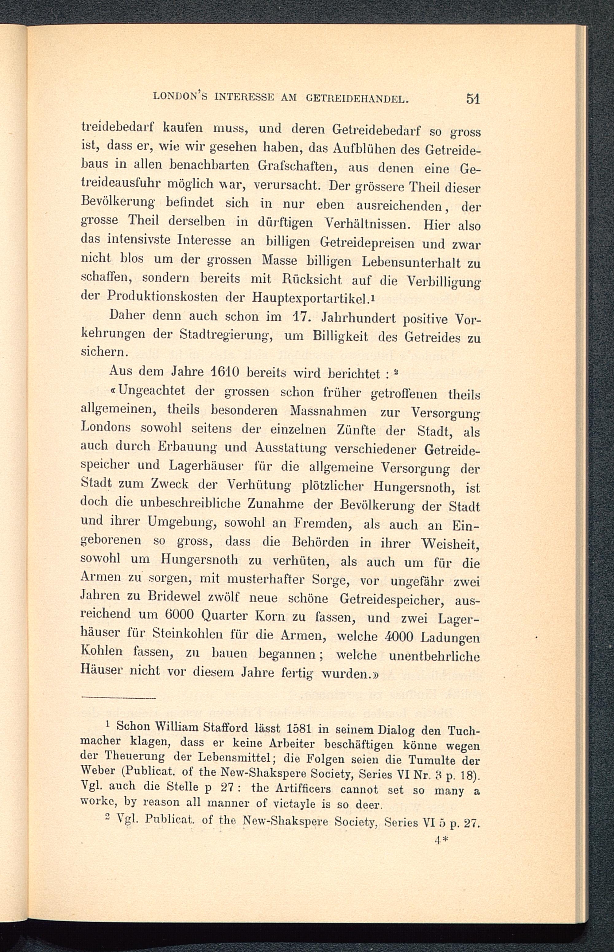 1 Schon William Stafford lässt 1581 in seinem Dialog den Tuch-macher klagen, dass er keine Arbeiter beschäftigen könne wegender Theuerung der Lebensmittel; die Folgen seien die Tumulte derWeber (Publicat. of the New-Shakspere Society, Series YI Nr. 8 p. 18).Vgl. auch die Stelle p 27 : the Artifficers cannot set so many aworkc, by reason all manner of vietayle is so deer.