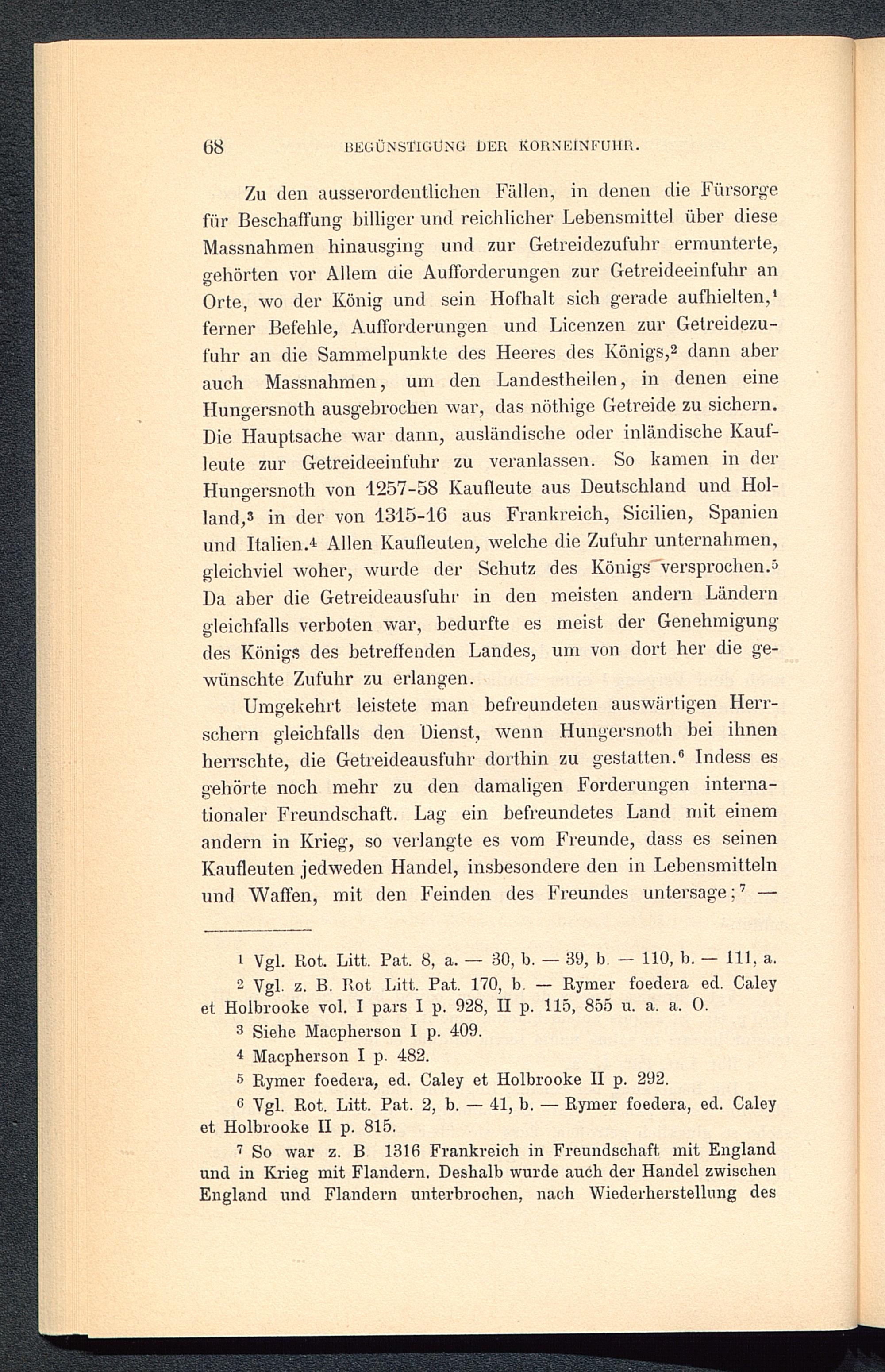 Zu den ausserordentlichen Fällen, in denen die Fürsorgefür Beschaffung billiger und reichlicher Lebensmittel über dieseMassnahmen hinausging und zur Getreidezufuhr ermunterte,gehörten vor Allem die Aufforderungen zur Getreideeinfuhr anOrte, wo der König und sein Hofhalt sich gerade aufhielten, 1 2 3 4ferner Befehle, Aufforderungen und Licenzen zur Getreidezu-fuhr an die Sammelpunkte des Heeres des Königs, 2 dann aberauch Massnahmen, um den Landestheilen, in denen eineHungersnoth ausgebrochen war, das nöthige Getreide zu sichern.Die Hauptsache war dann, ausländische oder inländische Kauf-leute zur Getreideeinfuhr zu veranlassen. So kamen in derHungersnoth von 1257-58 Kaufleute aus Deutschland und Hol-land, 3 in der von 1315-16 aus Frankreich, Sicilien, Spanien und Italien. 4 Allen Kaufleuten, welche die Zufuhr unternahmen,gleichviel woher, wurde der Schutz des Königs'versprochen. 5Da aber die Getreideausfuhr in den meisten andern Länderngleichfalls verboten war, bedurfte es meist der Genehmigungdes Königs des betreffenden Landes, um von dort her die ge-wünschte Zufuhr zu erlangen.