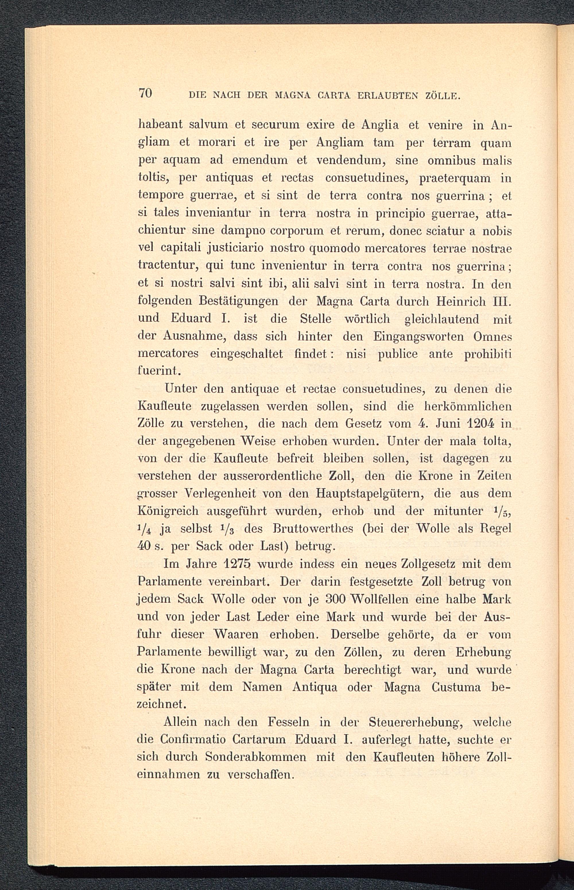 Im Jahre 1275 wurde indess ein neues Zollgesetz mit demParlamente vereinbart. Der darin festgesetzte Zoll betrug vonjedem Sack Wolle oder von je 300 Wollfellen eine halbe Markund von jeder Last Leder eine Mark und wurde bei der Aus-fuhr dieser Waaren erhoben. Derselbe gehörte, da er vomParlamente bewilligt war, zu den Zöllen, zu deren Erhebungdie Krone nach der Magna Carta berechtigt war, und wurdespäter mit dem Namen Antiqua oder Magna Custuma be-zeichnet.