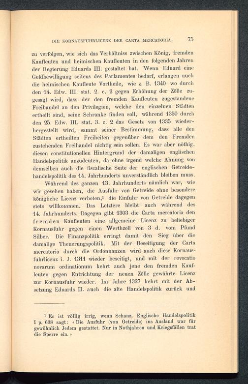 zu verfolgen, wie sieh das Verhältniss zwischen König, fremdenKaufleuten und heimischen Kaufleuten in den folgenden Jahrender Regierung Eduards III. gestaltet hat. Wenn Eduard eineGeldbewilligung seitens des Parlamentes bedarf, erlangen auchdie heimischen Kaufleute Vortheile, wie z. B. 1340 wo durchden 14. Edw. III. stat. 2. c. 2 gegen Erhöhung der Zölle zu-gesagt wird, dass der den fremden Kaufleuten zugestandeneFreihandel an den Privilegien, welche den einzelnen Städtenertheilt sind, seine Schranke finden soll, während 1350 durchden 25. Edw. III. stat. 3. c. 2 das Gesetz von 1335 wieder-hergestellt wird, sammt seiner Bestimmung, dass alle denStädten ertheilten Freiheiten gegenüber dem den Fremdenzustehenden Freihandel nichtig sein sollen. Es war aber nöthig,diesen constitutionellen Hintergrund der damaligen englischenHandelspolitik anzudeuten, da ohne irgend welche Ahnung vondemselben auch die liscalische Seite der englischen Getreide-handelspolitik des 14. Jahrhunderts unverständlich bleiben muss.