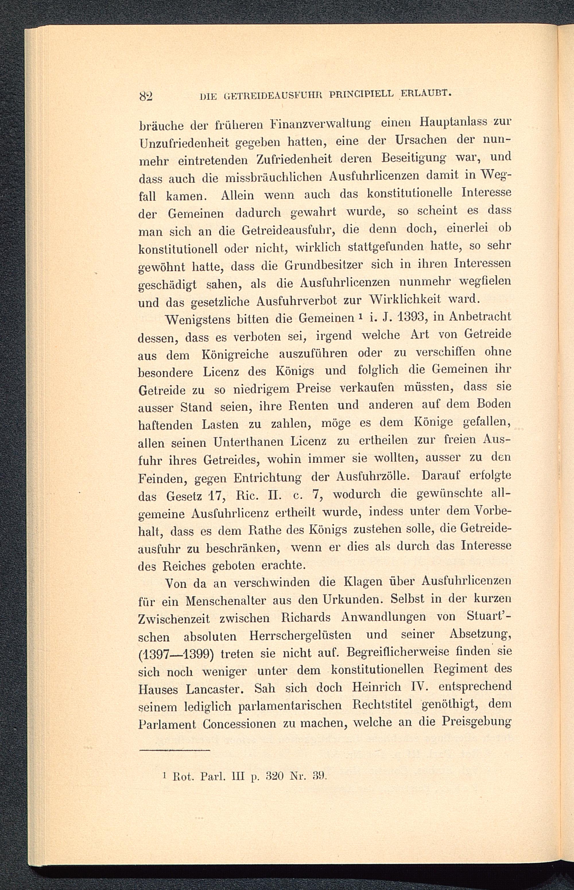 Wenigstens bitten die Gemeinen 1 i. J. 1393, in Anbetrachtdessen, dass es verboten sei, irgend welche Art von Getreideaus dem Königreiche auszuführen oder zu verschiffen ohnebesondere Licenz des Königs und folglich die Gemeinen ihrGetreide zu so niedrigem Preise verkaufen müssten, dass sieausser Stand seien, ihre Renten und anderen auf dem Bodenhaftenden Lasten zu zahlen, möge es dem Könige gefallen,allen seinen Unterthanen Licenz zu ertheilen zur freien Aus-fuhr ihres Getreides, wohin immer sie wollten, ausser zu denFeinden, gegen Entrichtung der Ausfuhrzölle. Darauf erfolgtedas Gesetz 17, Ric. II. c. 7, wodurch die gewünschte all-gemeine Ausfuhrlicenz ertheilt. wurde, indess unter dem Vorbe-halt, dass es dem Ratlie des Königs zustehen solle, die Getreide-ausfuhr zu beschränken, wenn er dies als durch das Interessedes Reiches geboten erachte.
