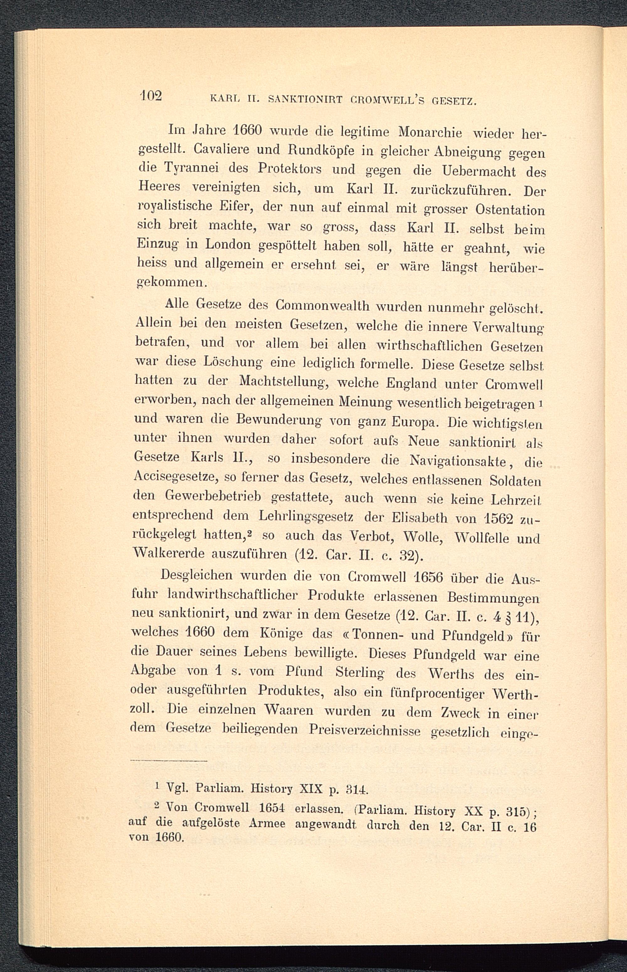 Alle Gesetze des Commonwealth wurden nunmehr gelöscht.Allein hei den meisten Gesetzen, welche die innere Verwaltungbetrafen, und vor allem hei allen wirthschaftlichen Gesetzenwar diese Löschung eine lediglich formelle. Diese Gesetze selbsthatten zu der Machtstellung, welche England unter Cromwellerworben, nach der allgemeinen Meinung wesentlich beigetragen >und waren die Bewunderung von ganz Europa . Die wichtigstenunter ihnen wurden daher sofort aufs Neue sanktionirl alsGesetze Karls II. , so insbesondere die Navigationsakte, dieAccisegesetze, so ferner das Gesetz, welches entlassenen Soldatenden Gewerbebetrieb gestattete, auch wenn sie keine Lehrzeit,entsprechend dem Lehrlingsgesetz der Elisabeth von 1562 zu-rückgelegl hatten ,2 so auch das Verbot, Wolle, Wollfelle undWalkererde auszuführen (12. Car. II. c. 32).
