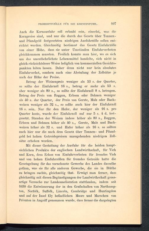 Mit dieser Gestattung der Ausfuhr für die beiden haupt-sächlichen Produkte der englischen Landwirtschaft, für Viehund Korn, dem Erlass von Einfuhrverboten für fremdes Viehund von hohen Einfuhrzöllen für fremdes Getreide hatte dieGesetzgebung für das vornehmste Gewerbe des Landes dasselbegethan, was sie für alle anderen Gewerbe, die sie in Blüthezu bringen suchte, gleichzeitig that. Erwägt man ferner, dassgleichzeitig mit diesen Begünstigungen der Landwirtschaft gross-artige Versuche zur Landesmelioration stattfanden, indem seit1630 die Entwässerung der in den Grafschaften von Northamp-ton, Norfolk, Suffolk, Lincoln, Cambridge und Huntingdon und auf der Insel Ely befindlichen Moore und Marschen vonPrivaten in Angriff genommen wurde, dass ferner die dargelegten
