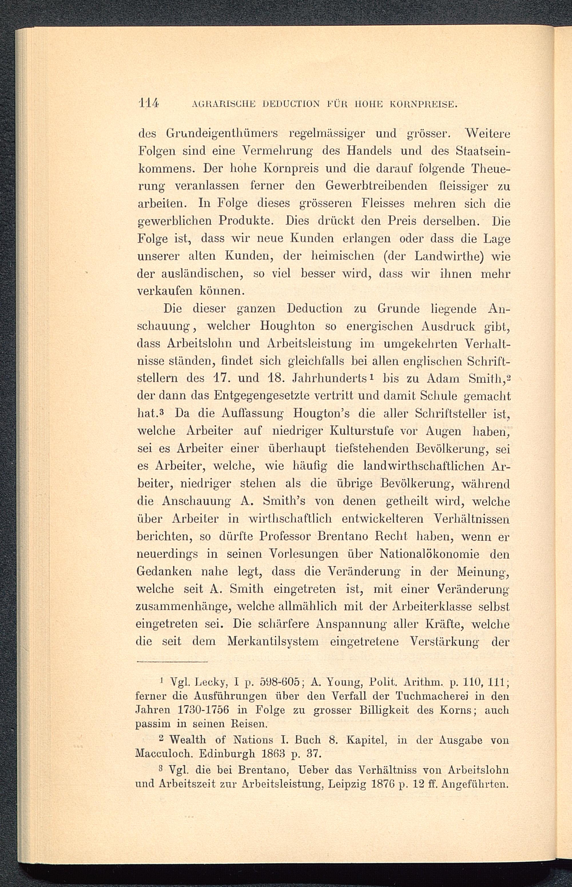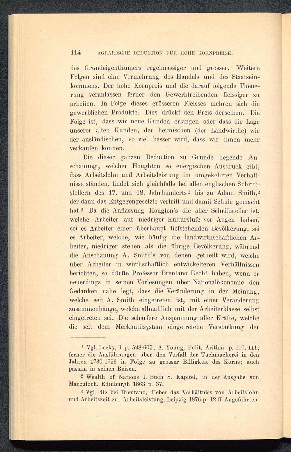 Die dieser ganzen Deduction zu Grunde liegende An-schauung, welcher Houghton so energischen Ausdruck gibt,dass Arbeitslohn und Arbeitsleistung im umgekehrten Verhält-nisse ständen, findet sich gleichfalls bei allen englischen Schrift-stellern des 17. und 18. Jahrhunderts 1 bis zu Adam Smith, 2der dann das Entgegengesetzte vertritt und damit Schule gemachthat. 3 Da die Auffassung Hougton’s die aller Schriftsteller ist,welche Arbeiter auf niedriger Kulturstufe vor Augen haben,sei es Arbeiter einer überhaupt tiefstehenden Bevölkerung, seies Arbeiter, welche, wie häufig die landwirtschaftlichen Ar-beiter, niedriger stehen als die übrige Bevölkerung, währenddie Anschauung A. Smith’s von denen geteilt wird, welcheüber Arbeiter in wirtschaftlich entwickelteren Verhältnissenberichten, so dürfte Professor Brentano Recht haben, wenn erneuerdings in seinen Vorlesungen über Nationalökonomie denGedanken nahe legt, dass die Veränderung in der Meinung,welche seit A. Smith eingetreten ist, mit einer Veränderung-Zusammenhänge, welche allmählich mit der Arbeiterklasse selbsteingetreten sei. Die schärfere Anspannung aller Kräfte, welchedie seit dem Merkantilsystem eingetretene Verstärkung der