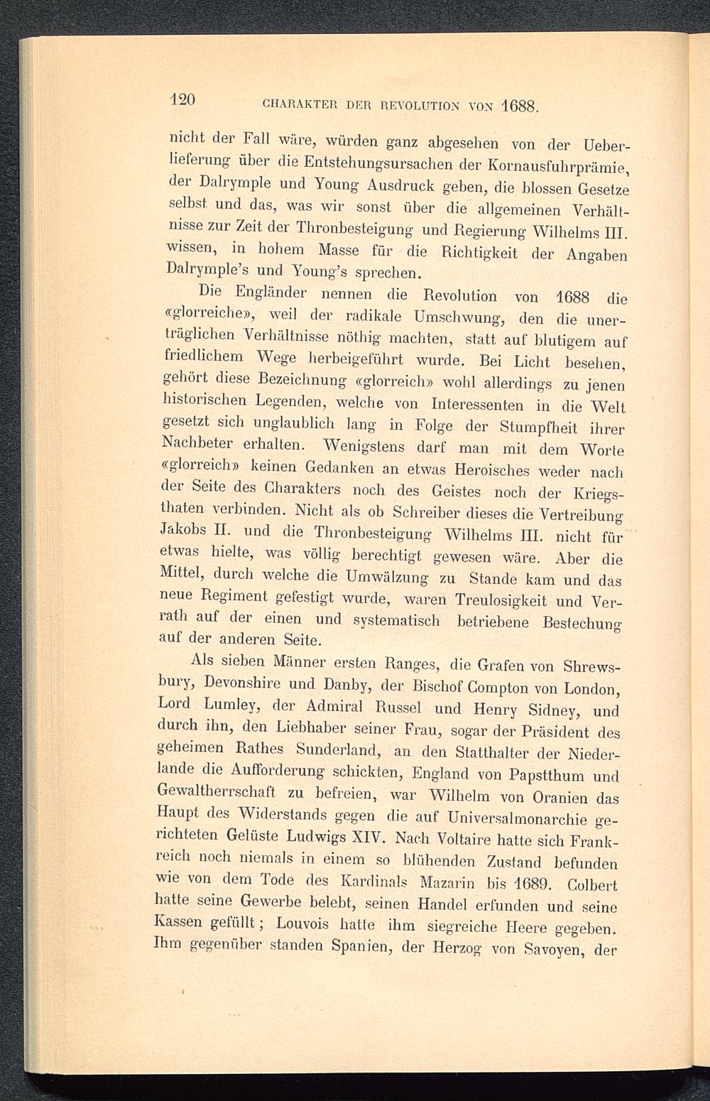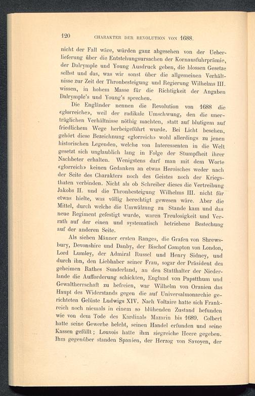 Die Engländer nennen die Revolution von 1688 die«glorreiche», weil der radikale Umschwung, den die uner-träglichen Verhältnisse nöthig machten, statt auf blutigem auffriedlichem Wege herbeigeführt wurde. Bei Licht besehen,gehört diese Bezeichnung «glorreich» wohl allerdings zu jenenhistorischen Legenden, welche von Interessenten in die Weltgesetzt sich unglaublich lang in Folge der Stumpfheit ihrerNachbeter erhalten. Wenigstens darf man mit dem Worte«glorreich» keinen Gedanken an etwas Heroisches weder nachder Seite des Charakters noch des Geistes noch der Kriegs-thaten verbinden. Nicht als ob Schreiber dieses die VertreibungJakobs II. und die Thronbesteigung Wilhelms III. nicht füretwas hielte, was völlig berechtigt gewesen wäre. Aber dieMittel, durch welche die Umwälzung zu Stande kam und dasneue Regiment gefestigt wurde, waren Treulosigkeit und Ver-rath auf der einen und systematisch betriebene Bestechungauf der anderen Seite.