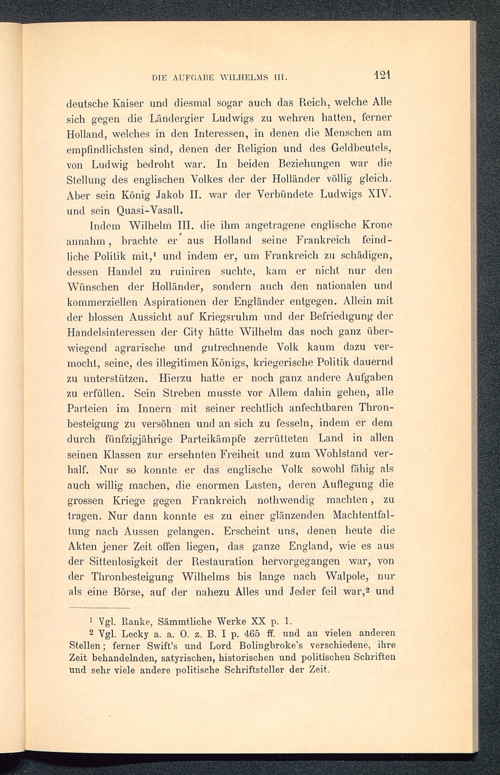 deutsche Kaiser und diesmal sogar auch das Reich, welche Allesich gegen die Ländergier Ludwigs zu wehren hatten, fernerHolland , welches in den Interessen, in denen die Menschen amempfindlichsten sind, denen der Religion und des Geldbeutels,von Ludwig bedroht war. In beiden Beziehungen war dieStellung des englischen Volkes der der Holländer völlig gleich.Aber sein König Jakob II. war der Verbündete Ludwigs XIV .und sein Quasi-Vasall.