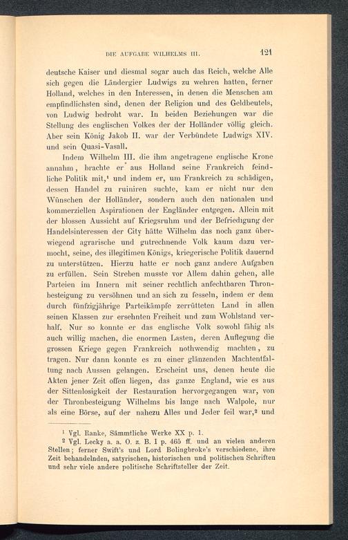 Indem Wilhelm III. die ihm angetragene englische Kroneannahm, brachte er aus Holland seine Frankreich feind-liche Politik mit , 1 und indem er, um Frankreich zu schädigen,dessen Handel zu ruiniren suchte, kam er nicht nur denWünschen der Holländer, sondern auch den nationalen undkommerziellen Aspirationen der Engländer entgegen. Allein mitder blossen Aussicht auf Kriegsruhm und der Befriedigung derHandelsinteressen der City hätte Wilhelm das noch ganz über-wiegend agrarische und gutrechnende Volk kaum dazu ver-mocht, seine, des illegitimen Königs, kriegerische Politik dauerndzu unterstützen. Hierzu hatte er noch ganz andere Aufgabenzu erfüllen. Sein Streben musste vor Allem dahin gehen, alleParteien im Innern mit seiner rechtlich anfechtbaren Thron-besteigung zu versöhnen und an sich zu fesseln, indem er demdurch fünfzigjährige Parteikämpfe zerrütteten Land in allenseinen Klassen zur ersehnten Freiheit und zum Wohlstand ver-halt. Nur so konnte er das englische Volk sowohl fähig alsauch willig machen, die enormen Lasten, deren Auflegung diegrossen Kriege gegen Frankreich nothwendig machten, zutragen. Nur dann konnte es zu einer glänzenden Machtentfal-tung nach Aussen gelangen. Erscheint uns, denen heute dieAkten jener Zeit offen liegen, das ganze England, wie es ausder Sittenlosigkeit. der Restauration hervorgegangen war, vonder Thronbesteigung Wilhelms bis lange nach Walpole, nurals eine Börse, auf der nahezu Alles und Jeder feil war , 2 und