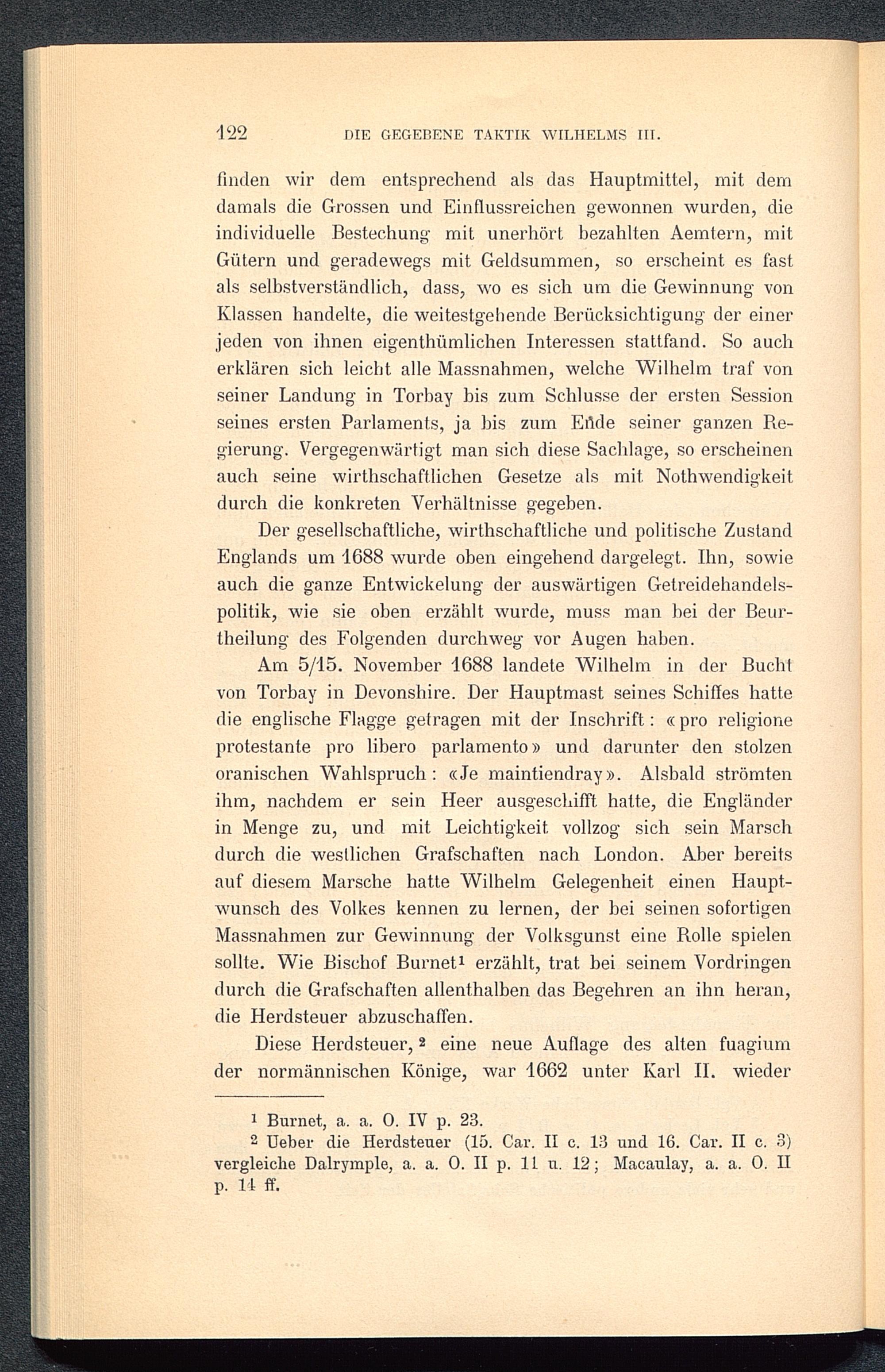 Am 5/15. November 1688 landete Wilhelm in der Buchtvon Torbay in Devonshire . Der Hauptmast seines Schiffes hattedie englische Flagge getragen mit der Inschrift: « pro religioneprotestante pro libero parlamento» und darunter den stolzenoranischen Wahl sprach : «Je maintiendray». Alsbald strömtenihm, nachdem er sein Heer ausgeschifft hatte, die Engländerin Menge zu, und mit Leichtigkeit vollzog sich sein Marschdurch die westlichen Grafschaften nach London . Aber bereitsauf diesem Marsche hatte Wilhelm Gelegenheit einen Haupt-wunsch des Volkes kennen zu lernen, der bei seinen sofortigenMassnahmen zur Gewinnung der Volksgunst eine Rolle spielensollte. Wie Bischof Burnet 1 erzählt, trat bei seinem Vordringendurch die Grafschaften allenthalben das Begehren an ihn heran,die Herdsteuer abzuschaflen.