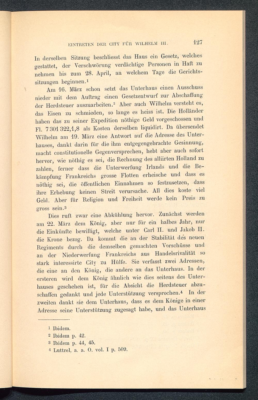 Dies ruft zwar eine Abkühlung hervor. Zunächst werdenam 22. März dem König, aber nur für ein halbes Jahr, nurdie Einkünfte bewilligt, welche unter Carl II. und Jakob II. die Krone bezog. Da kommt die an der Stabilität des neuenRegiments durch die demselben gemachten Vorschüsse undan der Niederwerfung Frankreichs aus Handelsrivalität sostark interessirte City zu Hülfe. Sie verfasst zwei Adressen,die eine an den König, die andere an das Unterhaus. In derersteren wird dem König ähnlich wie dies seitens des Unter-hauses geschehen ist, für die Absicht die Herdsteuer abzu-schaffen gedankt und jede Unterstützung versprochen. 4 In derzweiten dankt sie dem Unterhaus, dass es dem Könige in einerAdresse seine Unterstützung zugesagt habe, und das Unterhaus