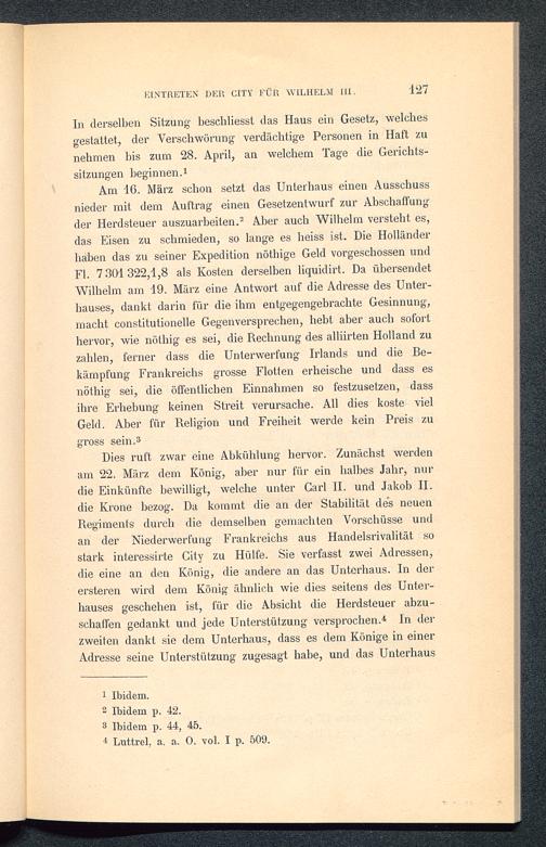 Am 16. März schon setzt das Unterhaus einen Ausschussnieder mit dem Auftrag einen Gesetzentwurf zur Abschaffungder Herdsteuer auszuarbeiten. 2 Aber auch Wilhelm versteht es,das Eisen zu schmieden, so lange es heiss ist. Die Holländerhaben das zu seiner Expedition nöthige Geld vorgeschossen undFl. 7 301322,1,8 als Kosten derselben liquidirt. Da übersendetWilhelm am 19. März eine Antwort auf die Adresse des Unter-hauses, dankt darin für die ihm entgegengebrachte Gesinnung,macht constitutionelle Gegenversprechen, hebt aber auch soforthervor, wie nöthig es sei, die Rechnung des alliirten Holland zuzahlen, ferner dass die Unterwerfung Irlands und die Be-kämpfung Frankreichs grosse Flotten erheische und dass esnöthig sei, die öffentlichen Einnahmen so festzusetzen, dassihre Erhebung keinen Streit verursache. All dies koste vielGeld. Aber für Religion und Freiheit werde kein Preis zugross sein. 3
