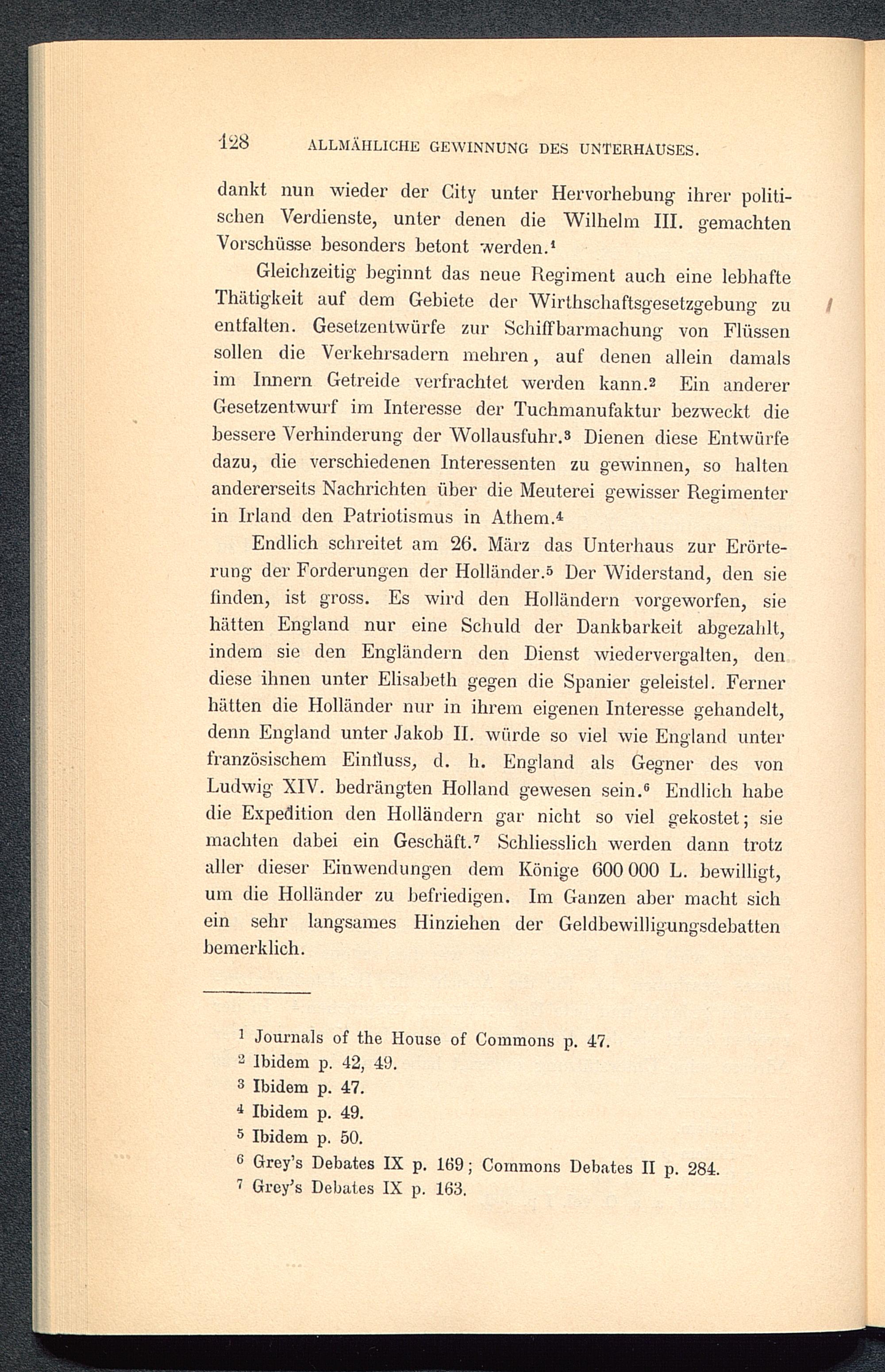 Endlich schreitet am 26. März das Unterhaus zur Erörte-rung der Forderungen der Holländer .0 Der Widerstand, den sielinden, ist gross. Es wird den Holländern vorgeworfen, siehätten England nur eine Schuld der Dankbarkeit abgezahlt,indem sie den Engländern den Dienst wiedervergalten, dendiese ihnen unter Elisabeth gegen die Spanier geleistel. Fernerhätten die Holländer nur in ihrem eigenen Interesse gehandelt,denn England unter Jakob II. würde so viel wie England unterfranzösischem Einfluss, d. li. England als Gegner des vonLudwig XIV. bedrängten Holland gewesen sein. 6 Endlich bähedie Expedition den Holländern gar nicht so viel gekostet; siemachten dabei ein Geschäft. 7 Schliesslich werden dann trotzaller dieser Einwendungen dem Könige 600 000 L. bewilligt,um die Holländer zu befriedigen. Im Ganzen aber macht sichein sehr langsames Hinziehen der Geldbewilligungsdebattenbemerklich.