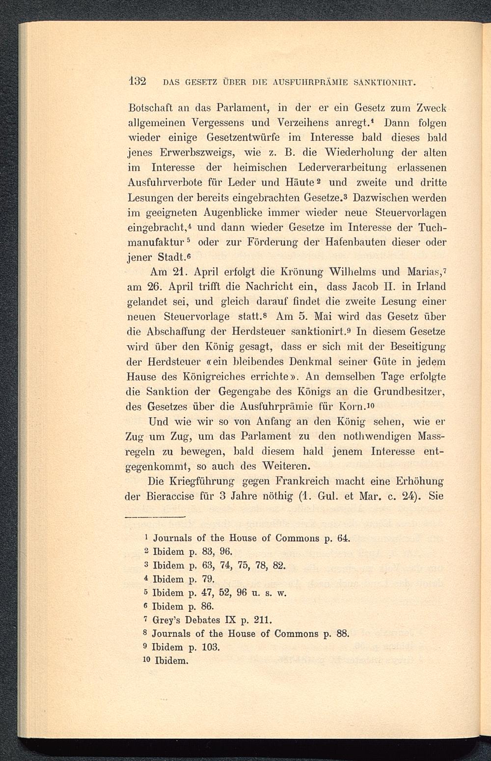 Am 21. April erfolgt die Krönung Wilhelms und Marias, 7am 26. April trifft die Nachricht ein, dass Jacob II. in Irland gelandet sei, und gleich darauf findet die zweite Lesung einerneuen Steuervorlage statt. 8 9 10 Am 5. Mai wird das Gesetz überdie Abschaffung der Herdsteuer sanktionirt.® In diesem Gesetzewird über den König gesagt, dass er sich mit der Beseitigungder Herdsteuer «ein bleibendes Denkmal seiner Güte in jedemHause des Königreiches errichte». An demselben Tage erfolgtedie Sanktion der Gegengabe des Königs an die Grundbesitzer,des Gesetzes über die Ausfuhrprämie für Korn. 1 ®