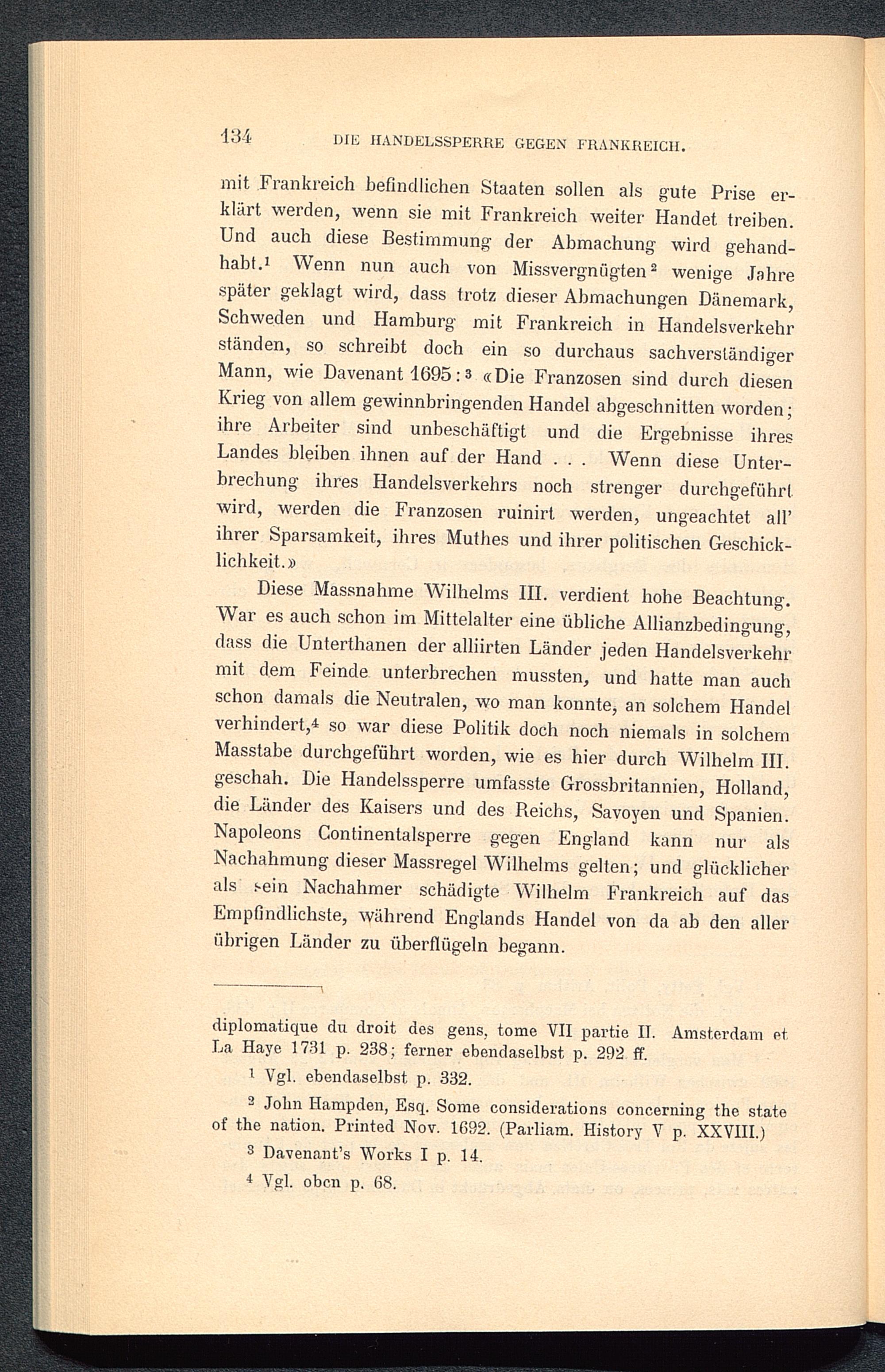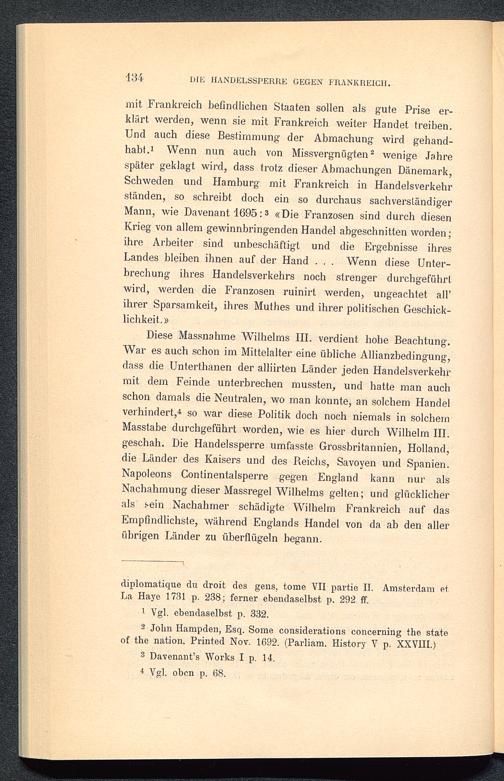 mit Frankreich befindlichen Staaten sollen als gute Prise er-klärt werden, wenn sie mit Frankreich weiter Iiandet treiben.Und auch diese Bestimmung der Abmachung wird gehand-habt. * 1 Wenn nun auch von Missvergnügten 2 3 wenige Jahrespäter geklagt wird, dass trotz dieser Abmachungen Dänemark, Schweden und Hamburg mit Frankreich in Handelsverkehrständen, so schreibt doch ein so durchaus sachverständigerMann, wie Davenant 1695:3 «Die Franzosen sind durch diesenKrieg von allem gewinnbringenden Handel abgeschnitten worden;ihre Arbeiter sind unbeschäftigt und die Ergebnisse ihresLandes bleiben ihnen auf der Hand . . . Wenn diese Unter-brechung ihres Handelsverkehrs noch strenger durchgeführlwird, werden die Franzosen ruinirt werden, ungeachtet all’ihrer Sparsamkeit, ihres Muthes und ihrer politischen Geschick-lichkeit.»