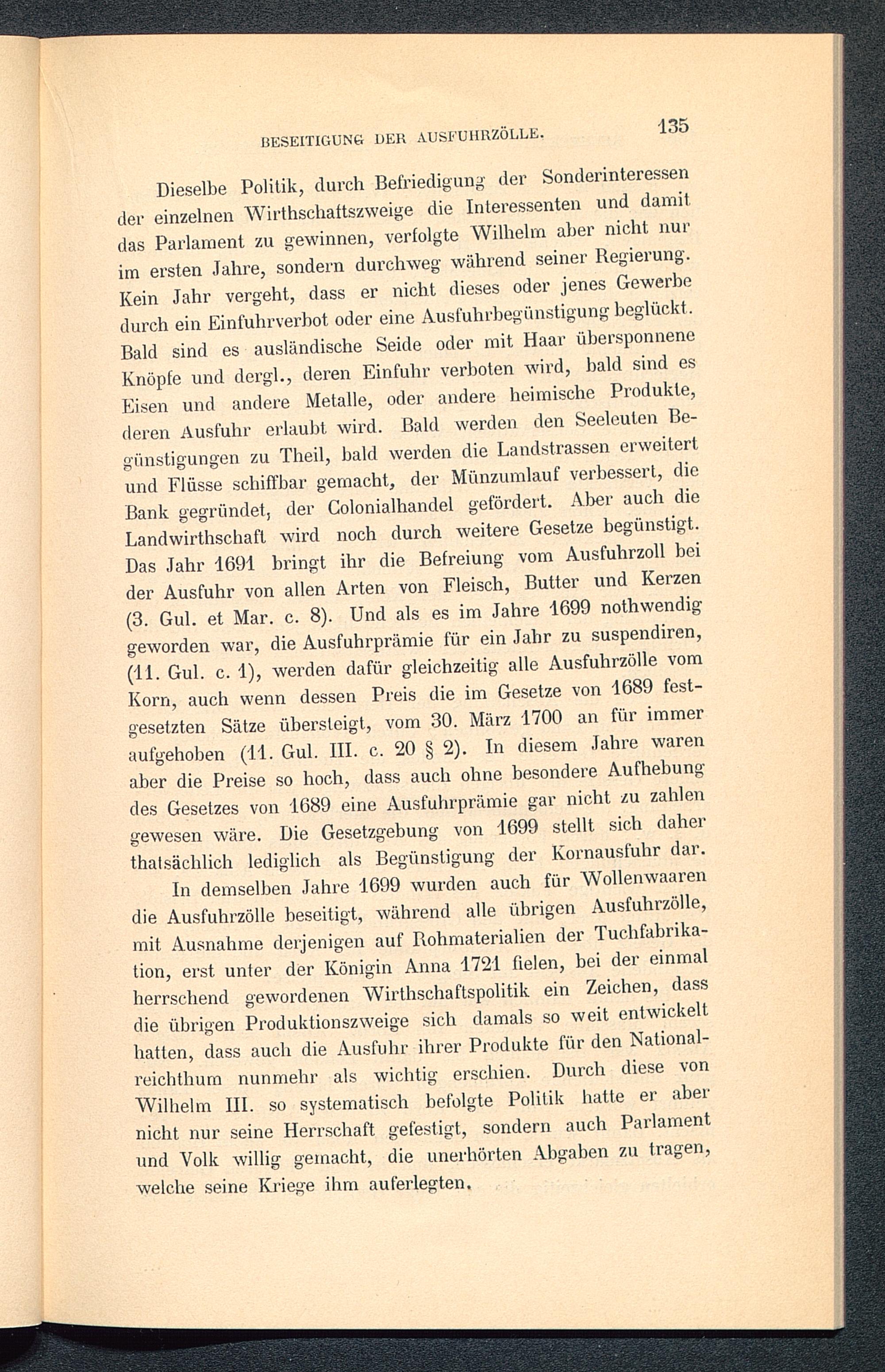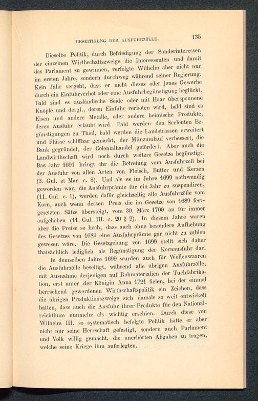 Dieselbe Politik, durch Befriedigung der Sonderinteressender einzelnen Wirtschaftszweige die Interessenten und damitdas Parlament zu gewinnen, verfolgte Wilhelm aber nicht nurim ersten Jahre, sondern durchweg während seiner Regierung.Kein Jahr vergeht, dass er nicht dieses oder jenes Gewerbedurch ein Einfuhrverbot oder eine Ausfuhrbegünstigung beglückt.Bald sind es ausländische Seide oder mit Haar übersponneneKnöpfe und dcrgl., deren Einfuhr verboten wird, bald sind esEisen und andere Metalle, oder andere heimische Produkte,deren Ausfuhr erlaubt wird. Bald werden den Seeleuten Be-günstigungen zu Theil, bald werden die Landstrassen erweitertund Flüsse schiffbar gemacht, der Münzumlauf verbessert, dieBank gegründet, der Colonialhandel gefördert. Aber auch dieLandwirthschafl wird noch durch weitere Gesetze begünstigt.Das Jahr 1691 bringt ihr die Befreiung vom Ausfuhrzoll beider Ausfuhr von allen Arten von Fleisch, Butter und Kerzen(3. Gul. et Mar. c. 8). Und als es im Jahre 1699 nothwendiggeworden war, die Ausfuhrprämie für ein Jahr zu suspendiren,(11. Gul. c. 1), werden dafür gleichzeitig alle Ausfuhrzölle vomKorn, auch wenn dessen Preis die im Gesetze von 1689 fest-gesetzten Sätze übersteigt, vom 30. März 1700 an für immeraufgehoben (11. Gul. III. c. 20 § 2). In diesem Jahre warenaber die Preise so hoch, dass auch ohne besondere Aufhebungdes Gesetzes von 1689 eine Ausfuhrprämie gar nicht zu zahlengewesen wäre. Die Gesetzgebung von 1699 stellt sich daherthatsächlich lediglich als Begünstigung der Kornausführ dar.