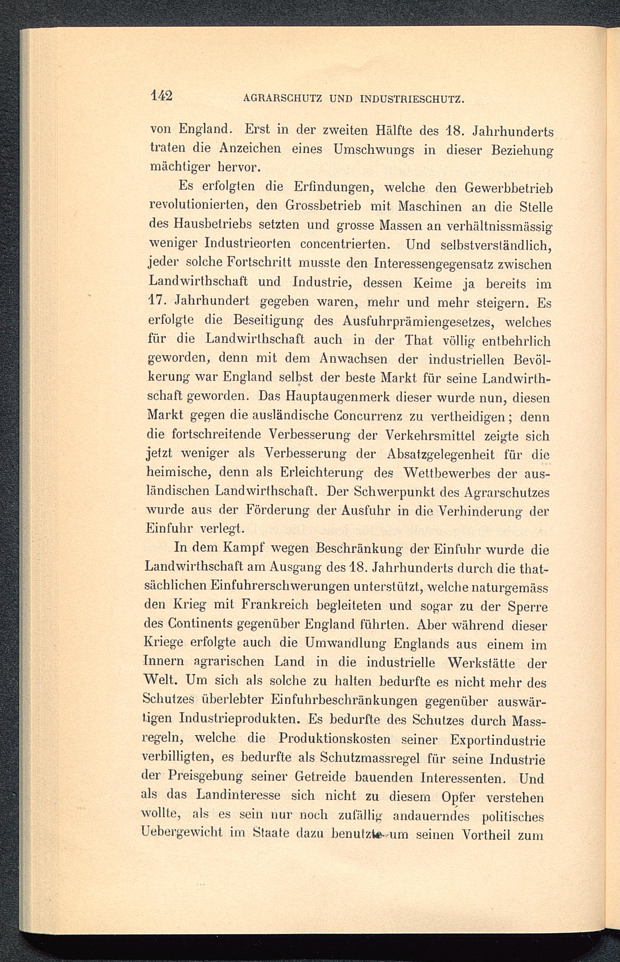 Es erfolgten die Erfindungen, welche den Gewerbbetriebrevolutionierten, den Grossbetrieb mit Maschinen an die Stelledes Hausbetriebs setzten und grosse Massen an verhältnissmässigweniger Industrieorten concentrierten. Und selbstverständlich,jeder solche Fortschritt musste den Interessengegensatz zwischenLandwirthschaft und Industrie, dessen Keime ja bereits im17. Jahrhundert gegeben waren, mehr und mehr steigern. Eserfolgte die Beseitigung des Ausfuhrprämiengesetzes, welchesfür die Landwirthschaft auch in der That völlig entbehrlichgeworden, denn mit dem Anwachsen der industriellen Bevöl-kerung war England selbst der beste Markt für seine Landwirth-schaft geworden. Das Hauptaugenmerk dieser wurde nun, diesenMarkt gegen die ausländische Concurrenz zu vertheidigen; denndie fortschreitende Verbesserung der Verkehrsmittel zeigte sichjetzt weniger als Verbesserung der Absatzgelegenheit für dieheimische, denn als Erleichterung des Wettbewerbes der aus-ländischen Landwirthschaft. Der Schwerpunkt des Agrarschutzeswurde aus der Förderung der Ausfuhr in die Verhinderung derEinfuhr verlegt.