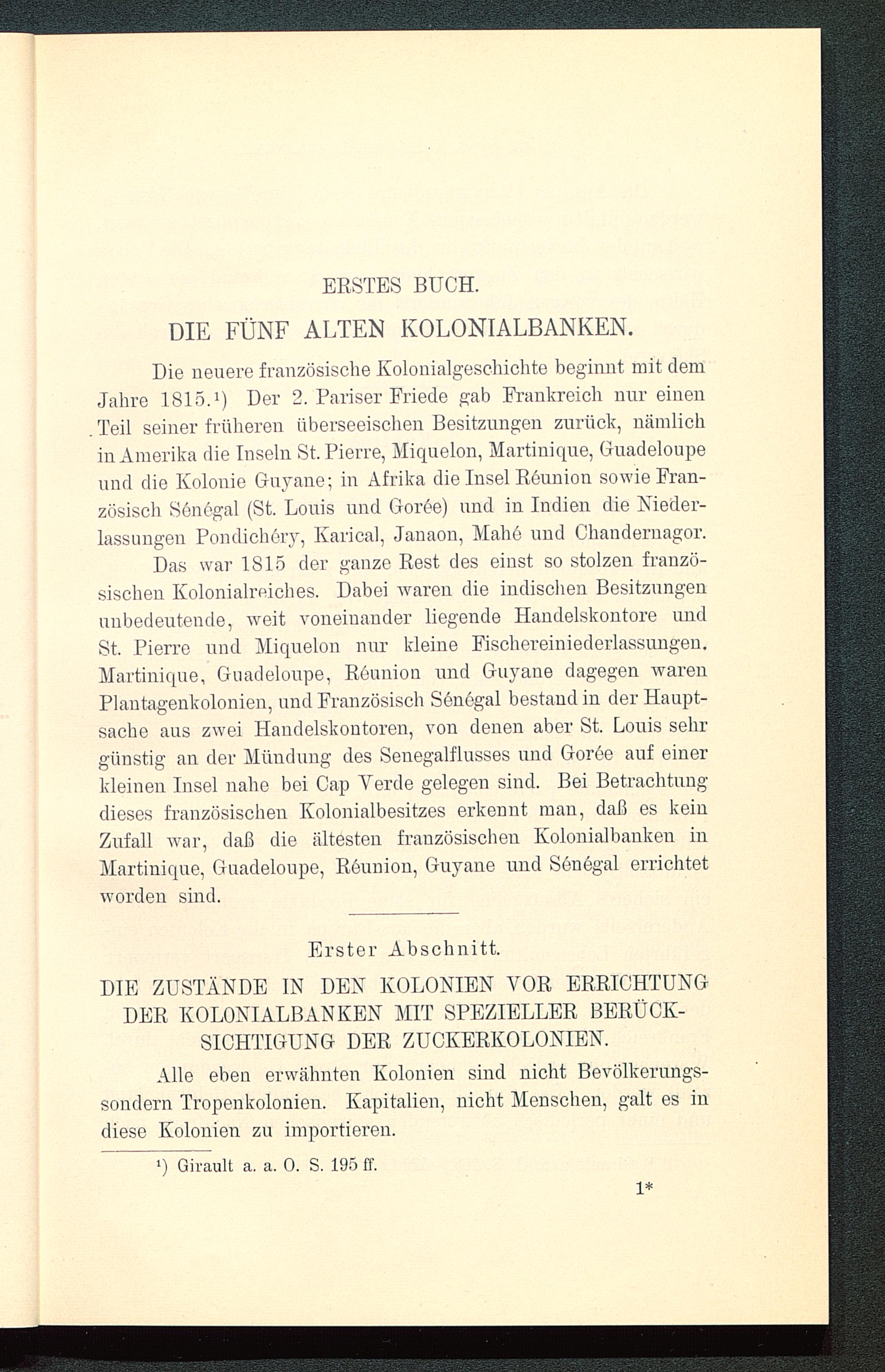 Das war 1815 der ganze Rest des einst so stolzen franzö-sischen Kolonialreiches. Dabei waren die indischen Besitzungenunbedeutende, weit voneinander liegende Handelskontore undSt. Pierre lind Miquelon nur kleine Fischereiniederlassungen.Martinique, Guadeloupe , Reunion und Guyane dagegen warenPlantagenkolonien, und Französisch Senegal bestand in der Haupt-sache aus zwei Handelskontoren, von denen aber St. Louis sehrgünstig an der Mündung des Senegalflusses und Goree auf einerkleinen Insel nahe bei Cap Verde gelegen sind. Bei Betrachtungdieses französischen Kolonialbesitzes erkennt man, daß es keinZufall war, daß die ältesten französischen Kolonialbanken inMartinique, Guadeloupe, Reunion, Guyane und Senegal errichtetworden sind.
