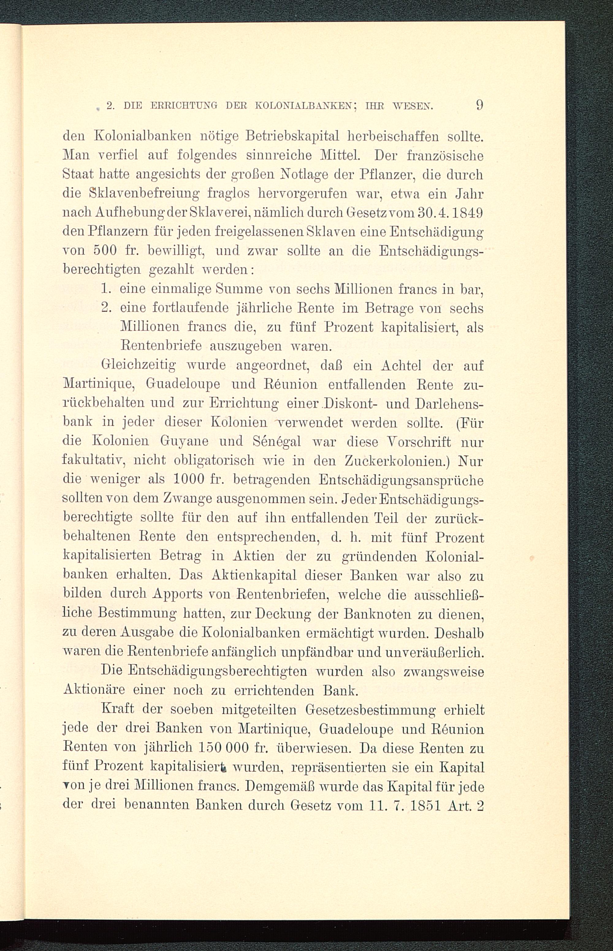 Kraft der soeben mitgeteilten Gesetzesbestimmung erhieltjede der drei Banken von Martinique, Guadeloupe und ReunionRenten von jährlich 150 000 fr. überwiesen. Da diese Renten zufünf Prozent kapitalisiert wurden, repräsentierten sie ein KapitalTon je drei Millionen francs. Demgemäß wurde das Kapital für jededer drei benannten Banken durch Gesetz vom 11. 7. 1851 Art. 2