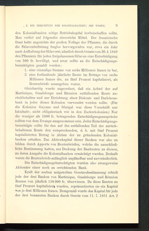 den Kolonialbanken nötige Betriebskapital herbeischaffen sollte.Man verfiel auf folgendes sinnreiche Mittel. Der französischeStaat hatte angesichts der großen Notlage der Pflanzer, die durchdie Sklavenbefreiung fraglos hervorgerufen war, etwa ein Jahrnach Aufhebung der Sklaverei, nämlich durch Gesetz vom 30.4.1849den Pflanzern für jeden freigelassenen Sklaven eine Entschädigungvon 500 fr. bewilligt, und. zwar sollte an die Entschädigungs-berechtigten gezahlt werden: