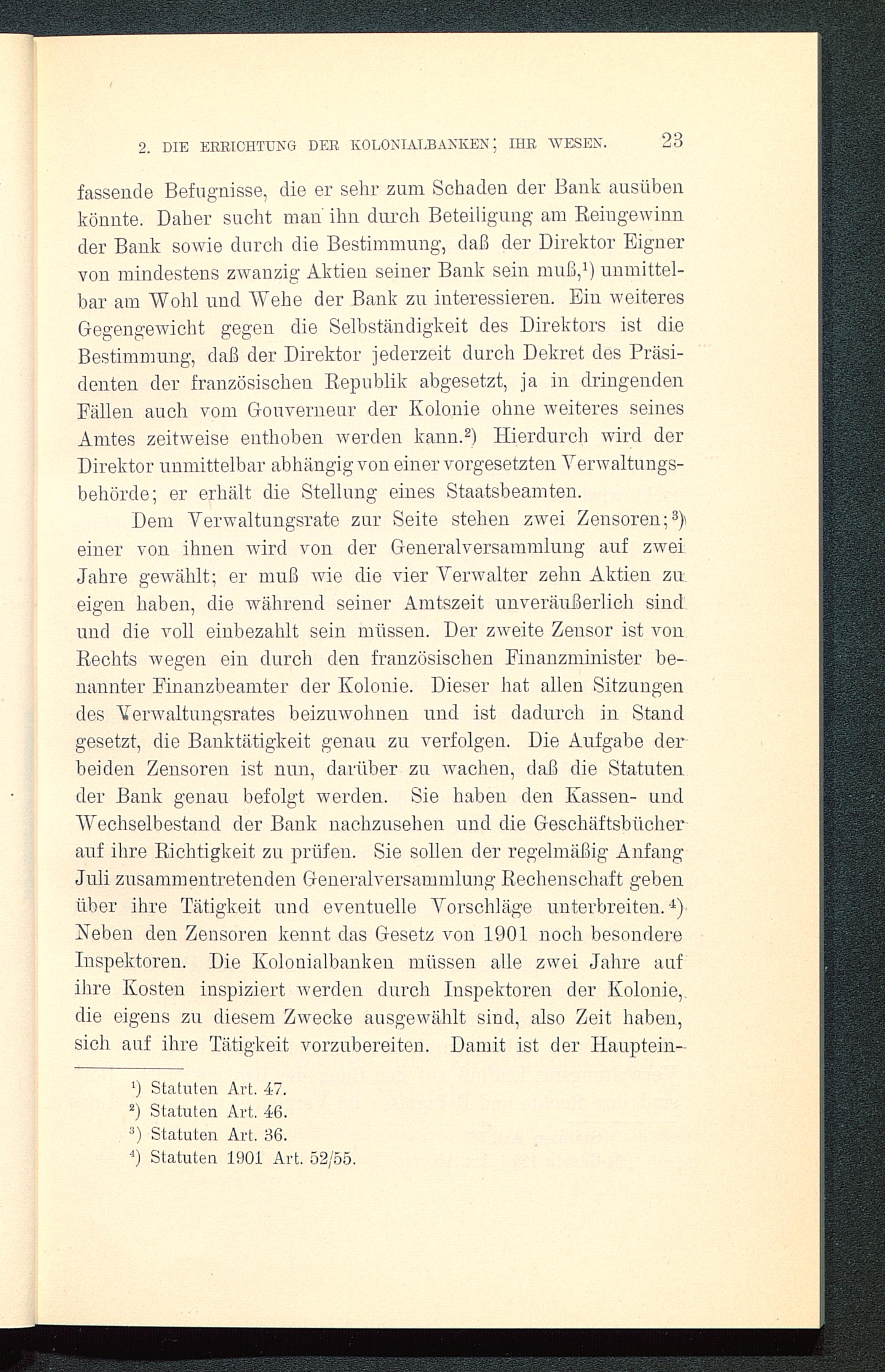 fassende Befugnisse, die er sehr zum Schaden der Bank ausübenkönnte. Daher sucht man ihn durch Beteiligung am Beingewinnder Bank sowie durch die Bestimmung, daß der Direktor Eignervon mindestens zwanzig Aktien seiner Bank sein muß, 1 ) unmittel-bar am Wohl und Wehe der Bank zu interessieren. Ein weiteresGegengewicht gegen die Selbständigkeit des Direktors ist dieBestimmung, daß der Direktor jederzeit durch Dekret des Präsi-denten der französischen Republik abgesetzt, ja in dringendenFällen auch vom Gouverneur der Kolonie ohne weiteres seinesAmtes zeitweise enthoben werden kann. 2 ) Hierdurch wird derDirektor unmittelbar abhängig von einer vorgesetzten Verwaltungs-behörde; er erhält die Stellung eines Staatsbeamten.