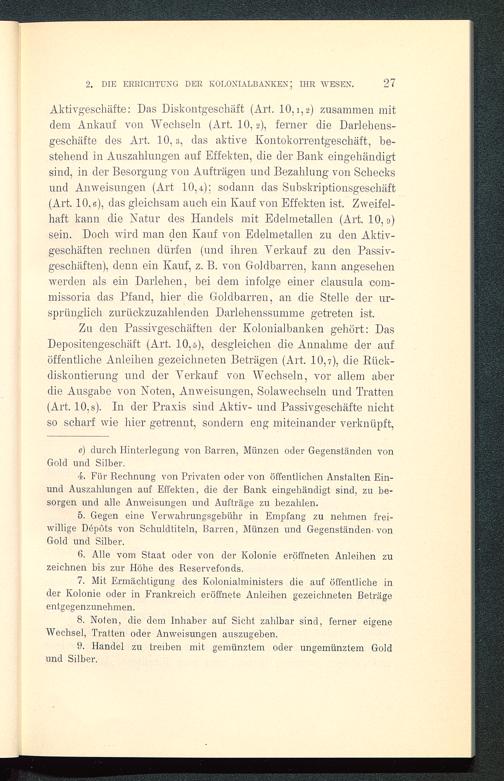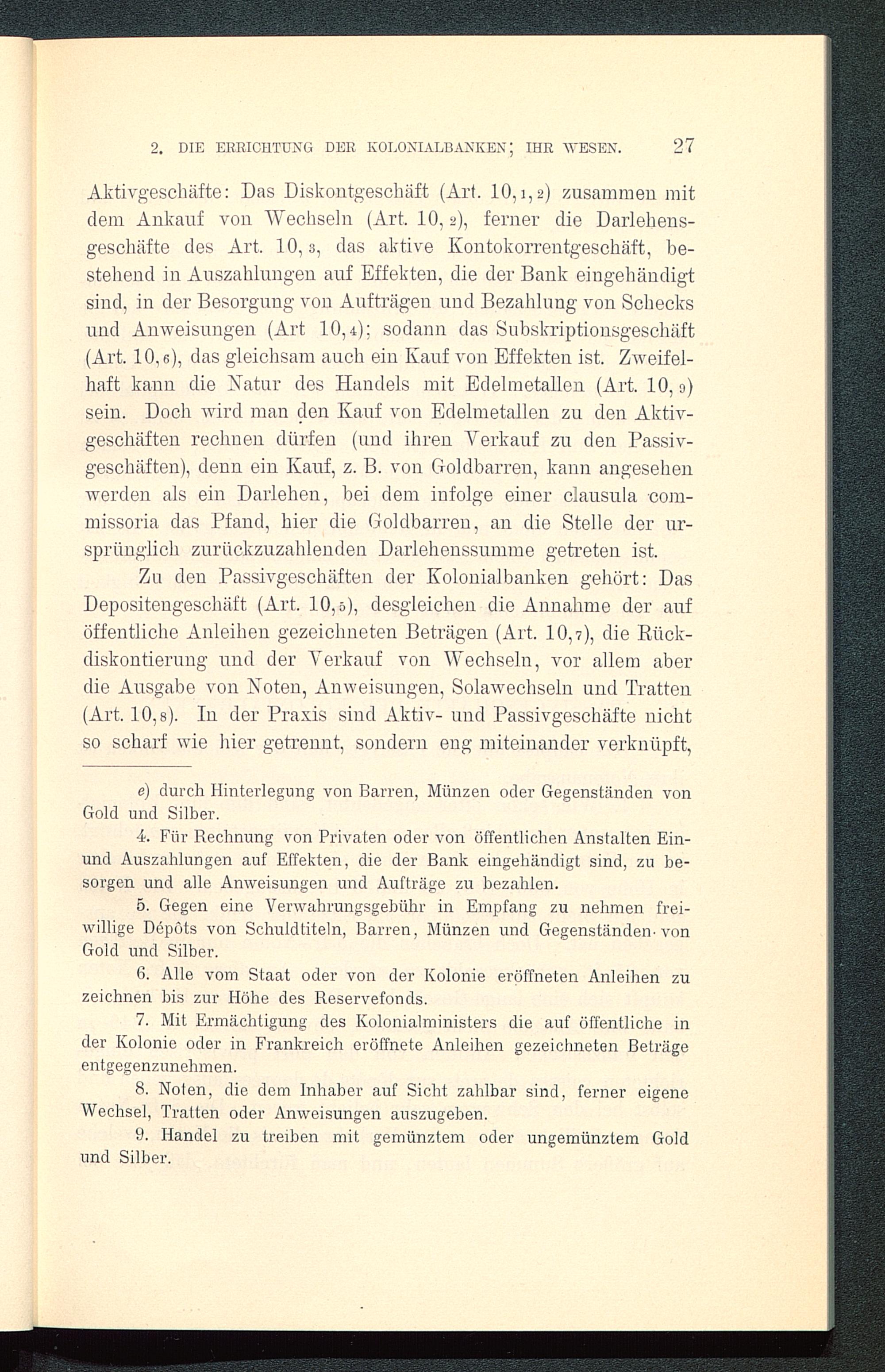 Zu den Passivgeschäften der Kolonialbanken gehört: DasDepositengeschäft (Art. 10,5), desgleichen die Annahme der auföffentliche Anleihen gezeichneten Beträgen (Art. 10,7), die Rück-diskontierung und der Verkauf von Wechseln, vor allem aberdie Ausgabe von Noten, Anweisungen, Solawechseln und Tratten(Art. 10,8). In der Praxis sind Aktiv- und Passivgeschäfte nichtso scharf wie hier getrennt, sondern eng miteinander verknüpft,