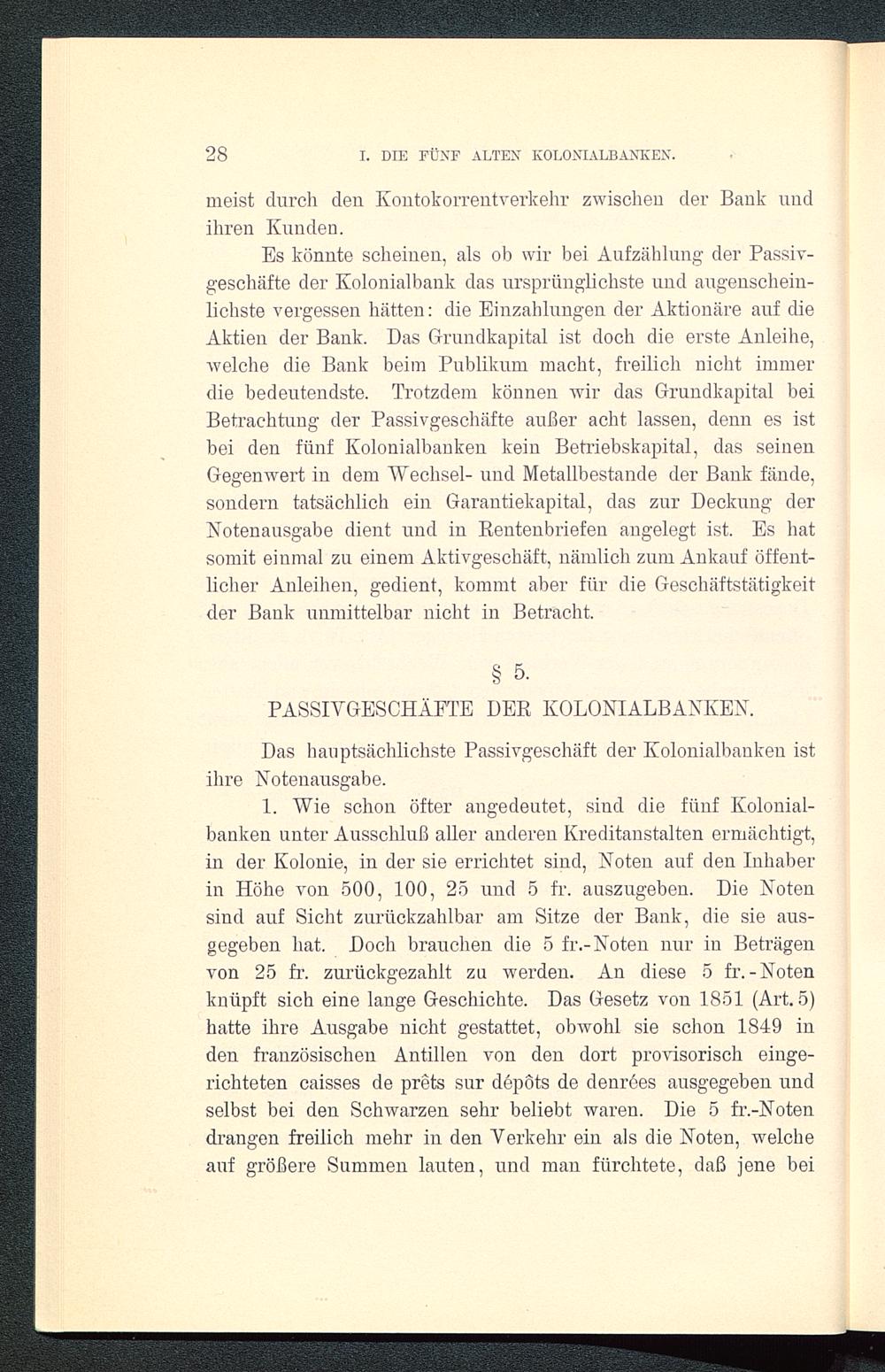 1. Wie schon öfter angedeutet, sind die fünf Kolonial-banken unter Ausschluß aller anderen Kreditanstalten ermächtigt,in der Kolonie, in der sie errichtet sind, Noten auf den Inhaberin Höhe von 500, 100, 25 und 5 fr. auszugeben. Die Notensind auf Sicht zurückzahlbar am Sitze der Bank, die sie aus-gegeben hat. Doch brauchen die 5 fr.-Noten nur in Beträgenvon 25 fr. zurückgezahlt zu werden. An diese 5 fr.-Notenknüpft sich eine lange Geschichte. Das Gesetz von 1851 (Art. 5)hatte ihre Ausgabe nicht gestattet, obwohl sie schon 1849 inden französischen Antillen von den dort provisorisch einge-richteten caisses de prets sur depöts de denrees ausgegeben undselbst bei den Schwarzen sehr beliebt waren. Die 5 fr.-Notendrangen freilich mehr in den Verkehr ein als die Noten, welcheauf größere Summen lauten, und man fürchtete, daß jene bei