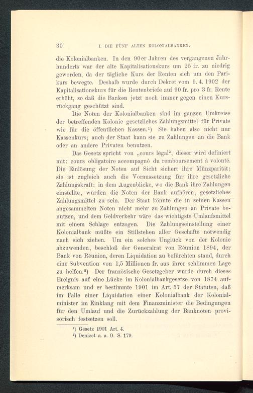 die Kolonialbanken. In den 90 er Jahren des vergangenen Jahr-hunderts war der alte Kapitalisationskurs um 25 fr. zu niedriggeworden, da der tägliche Kurs der Renten sich um den Pari-kurs bewegte. Deshalb wurde durch Dekret vom 9.4.1902 derKapitalisationskurs für die Rentenbriefe auf 90 fr. pro 3 fr. Renteerhöht, so daß die Banken jetzt noch immer gegen einen Kurs-rückgang geschützt sind.