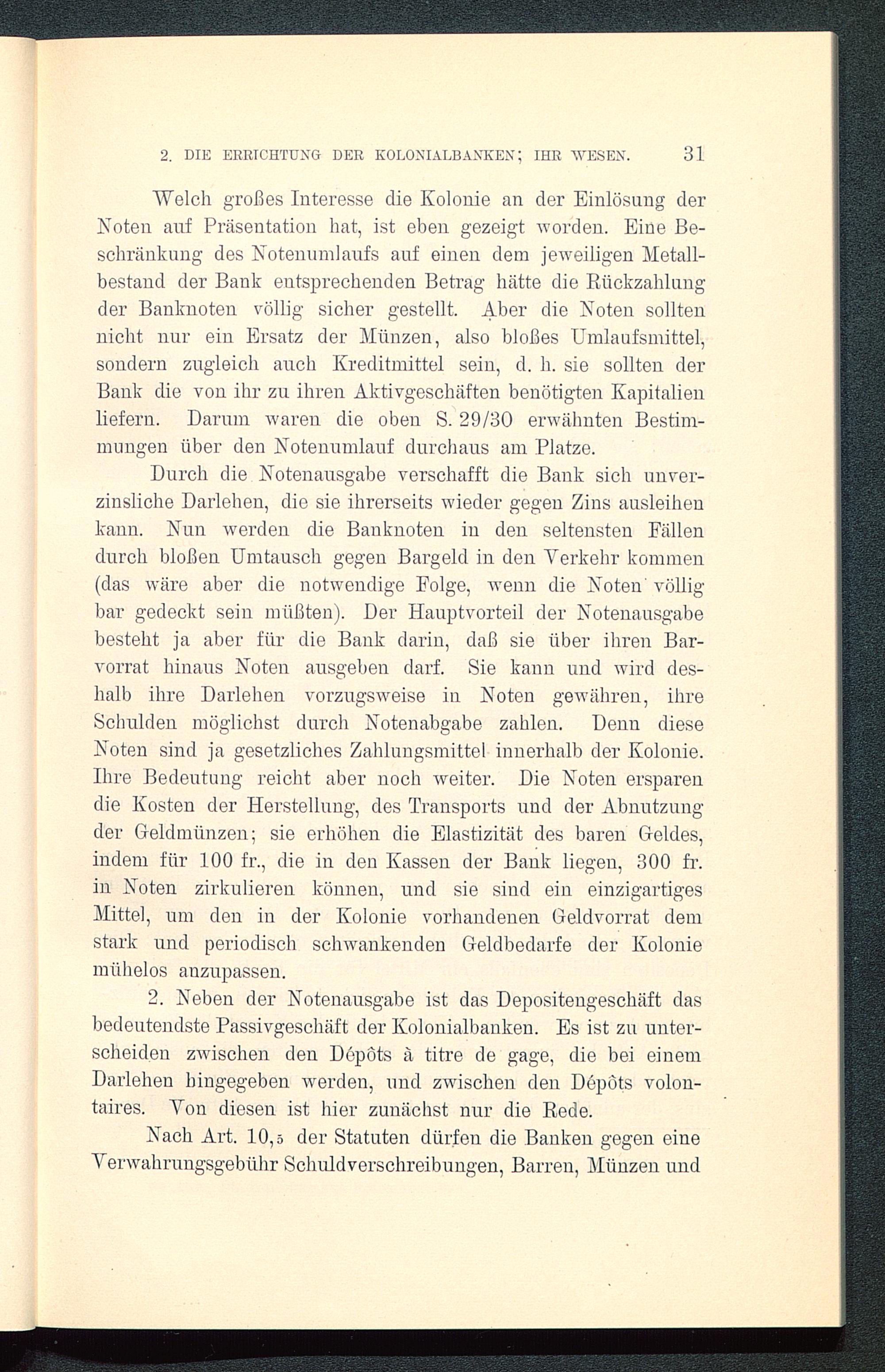 "Welch großes Interesse die Kolonie an der Einlösung derKoten auf Präsentation hat, ist eben gezeigt worden. Eine Be-schränkung des Notenumlaufs auf einen dem jeweiligen Metall-bestand der Bank entsprechenden Betrag hätte die Rückzahlungder Banknoten völlig sicher gestellt. Aber die Noten solltennicht nur ein Ersatz der Münzen, also bloßes Umlaufsinittel,sondern zugleich auch Kreditmittel sein, d. h. sie sollten derBank die von ihr zu ihren Aktivgeschäften benötigten Kapitalienliefern. Darum waren die oben S. 29/30 erwähnten Bestim-mungen über den Notenumlauf durchaus am Platze.