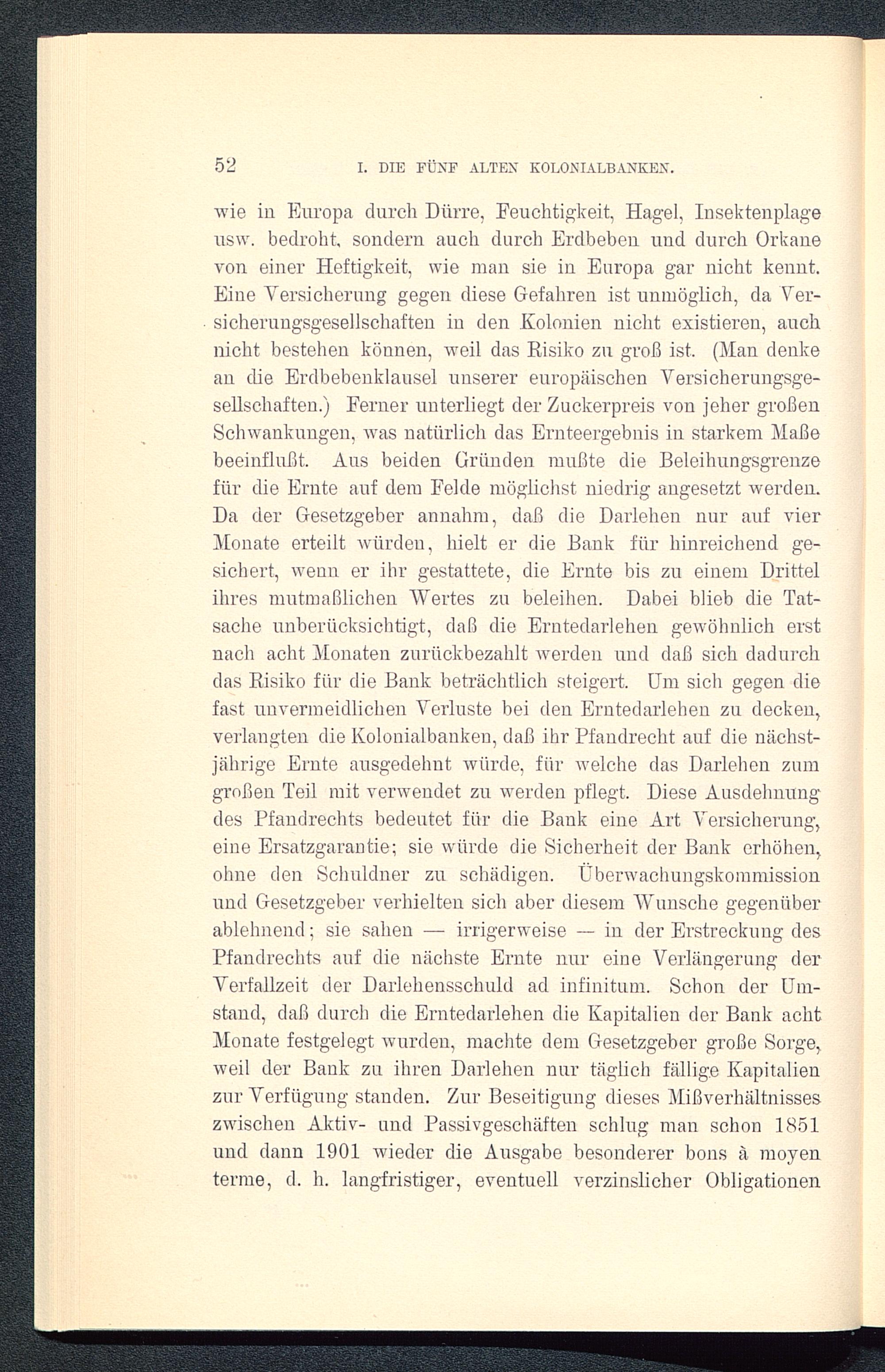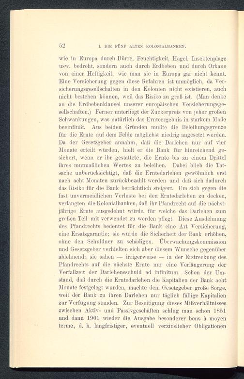 wie in Europa durch Dürre, Feuchtigkeit, Hagel, Insektenplageusw. bedroht, sondern auch durch Erdbeben und durch Orkanevon einer Heftigkeit, wie man sie in Europa gar nicht kennt.Eine Versicherung gegen diese Gefahren ist unmöglich, da Ver-sicherungsgesellschaften in den Kolonien nicht existieren, auchnicht bestehen können, weil das Risiko zu groß ist. (Man denkean die Erdbebenklausel unserer europäischen Versicherungsge-sellschaften.) Ferner unterliegt der Zuckerpreis von jeher großenSchwankungen, was natürlich das Ernteergebnis in starkem Maßebeeinflußt. Aus beiden Gründen mußte die Beleihungsgrenzefür die Ernte auf dem Felde möglichst niedrig angesetzt werdeu.Da der Gesetzgeber annahm, daß die Darlehen nur auf vierMonate erteilt würden, hielt er die Bank für hinreichend ge-sichert, wenn er ihr gestattete, die Ernte bis zu einem Drittelihres mutmaßlichen Wertes zu beleihen. Dabei blieb die Tat-sache unberücksichtigt, daß die Erntedarlehen gewöhnlich erstnach acht Monaten zurückbezahlt werden und daß sich dadurchdas Risiko für die Bank beträchtlich steigert. Um sich gegen diefast unvermeidlichen Verluste bei den Erntedarlehen zu decken,verlangten die Kolonialbanken, daß ihr Pfandrecht auf die nächst-jährige Ernte ausgedehnt würde, für welche das Darlehen zumgroßen Teil mit verwendet zu werden pflegt. Diese Ausdehnungdes Pfandrechts bedeutet für die Bank eine Art Versicherung,eine Ersatzgarantie; sie würde die Sicherheit der Bank erhöhen,ohne den Schuldner zu schädigen. Überwachungskommissionund Gesetzgeber verhielten sich aber diesem Wunsche gegenüberablehnend; sie sahen — irrigerweise — in der Erstreckung desPfandrechts auf die nächste Ernte nur eine Verlängerung derVerfallzeit der Darlehensschuld ad infinitum. Schon der Um-stand, daß durch die Erntedarlehen die Kapitalien der Bank achtMonate festgelegt wurden, machte dem Gesetzgeber große Sorge,weil der Bank zu ihren Darlehen nur täglich fällige Kapitalienzur Verfügung standen. Zur Beseitigung dieses Mißverhältnisseszwischen Aktiv- und Passivgeschäften schlug man schon 1851und dann 1901 wieder die Ausgabe besonderer bons ä raoyenterrae, d. h. langfristiger, eventuell verzinslicher Obligationen