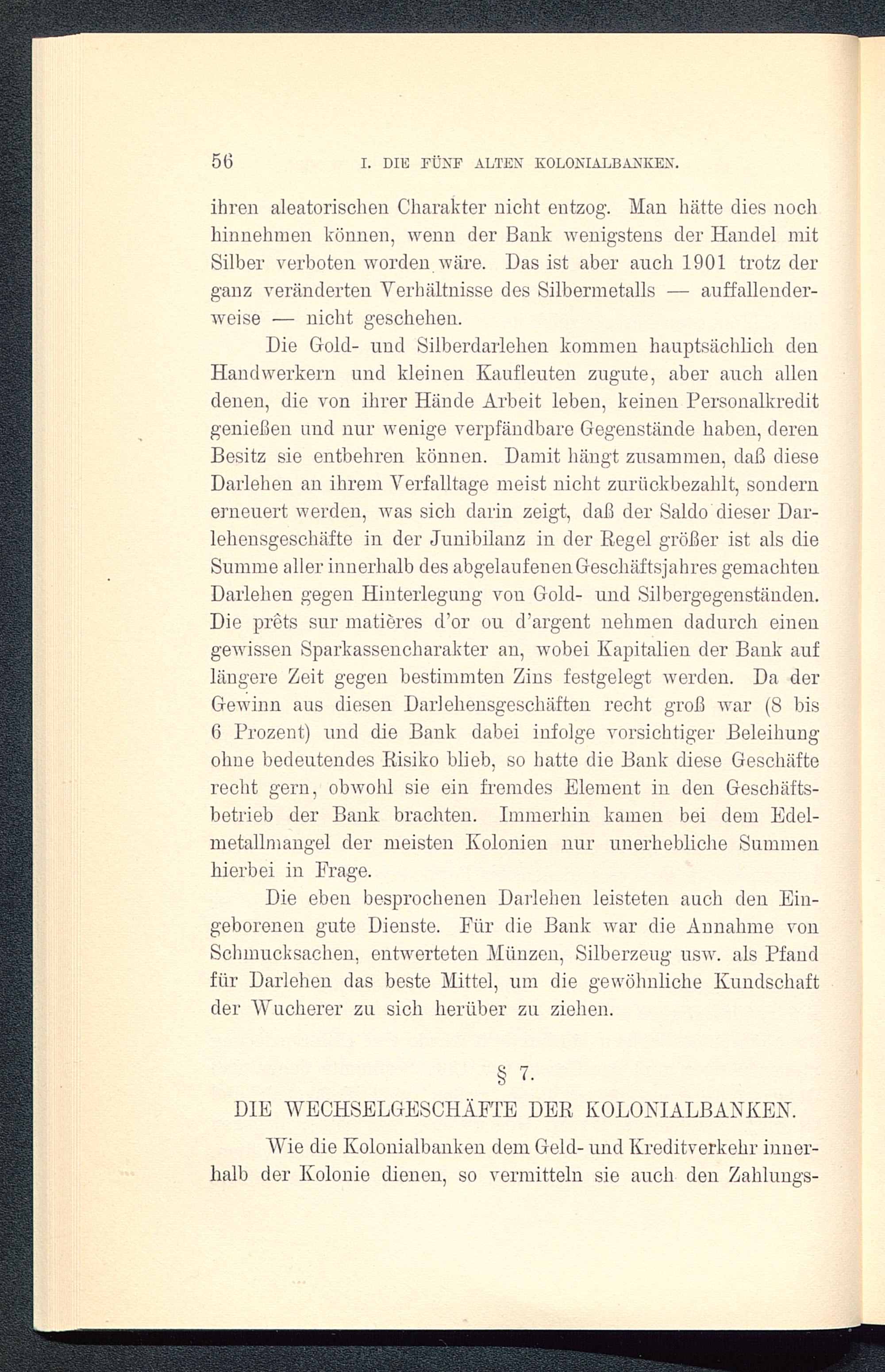 Die eben besprochenen Darlehen leisteten auch den Ein-geborenen gute Dienste. Für die Bank war die Annahme vonSchmucksachen, entwerteten Münzen, Silberzeug usw. als Pfandfür Darlehen das beste Mittel, um die gewöhnliche Kundschaftder Wucherer zu sich herüber zu ziehen.