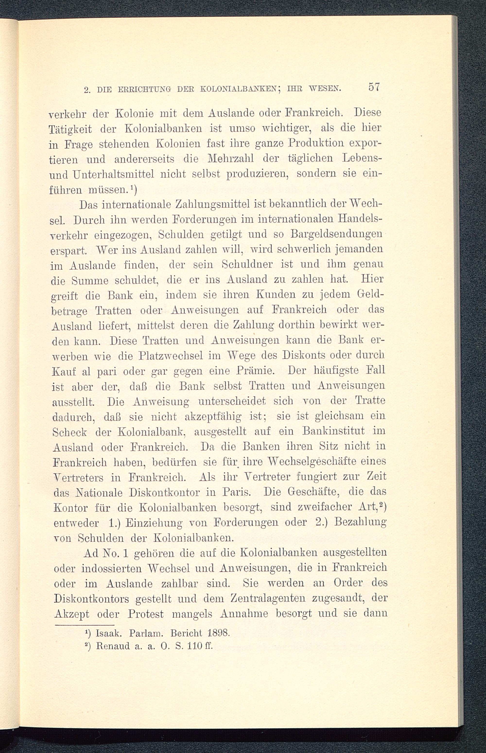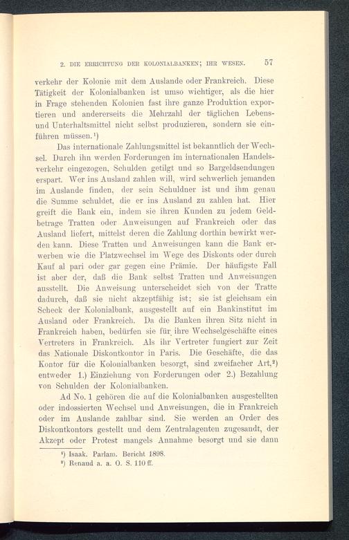 Das internationale Zahlungsmittel ist bekanntlich der "Wech-sel. Durch ihn werden Forderungen im internationalen Handels-verkehr eingezogen, Schulden getilgt und so Bargeldsendungenerspart. Wer ins Ausland zahlen will, wird schwerlich jemandenim Auslande finden, der sein Schuldner ist und ihm genaudie Summe schuldet, die er ins Ausland zu zahlen hat. Hiergreift die Bank ein, indem sie ihren Kunden zu jedem Geld-betrage Tratten oder Anweisungen auf Frankreich oder dasAusland liefert, mittelst deren die Zahlung dorthin bewirkt wer-den kann. Diese Tratten und Anweisungen kann die Bank er-werben wie die Platzwechsel im Wege des Diskonts oder durchKauf al pari oder gar gegen eine Prämie. Der häufigste Fallist aber der, daß die Bank selbst Tratten und Anweisungenausstellt. Die Anweisung unterscheidet sich von der Trattedadurch, daß sie nicht akzeptfähig ist; sie ist gleichsam einScheck der Kolonialbank, ausgestellt auf ein Bankinstitut imAusland oder Frankreich . Da die Banken ihren Sitz nicht inFrankreich haben, bedürfen sie für ihre Wechselgeschäfte einesVertreters in Frankreich . Als ihr Vertreter fungiert zur Zeitdas Kationale Diskontkontor in Paris . Die Geschäfte, die dasKontor für die Kolouialbanken besorgt, sind zweifacher Art, 2 )entweder 1.) Einziehung von Forderungen oder 2.) Bezahlungvon Schulden der Kolonialbauken.