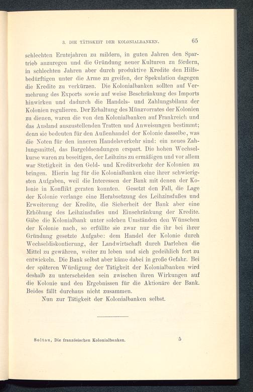 schlechten Erntejahren zu mildern, in guten Jahren den Spar-trieb anzuregen und die Gründung neuer Kulturen zu fördern,in schlechten Jahren aber durch produktive Kredite den Hilfs-bedürftigen unter die Arme zu greifen, der Spekulation dagegendie Kredite zu verkürzen. Die Kolonialbanken sollten auf Ver-mehrung des Exports sowie auf weise Beschränkung des Importshinwirken und dadurch die Handels- und Zahlungsbilanz derKolonien regulieren. Der Erhaltung des Münzvorrates der Kolonienzu dienen, waren die von den Kolonialbanken auf Frankreich unddas Ausland auszustellenden Tratten und Anweisungen bestimmt;denn sie bedeuten für den Außenhandel der Kolonie dasselbe, wasdie Noten für den inneren Handelsverkehr sind: ein neues Zah-lungsmittel, das Bargeldsendungon erspart. Die hohen Wechsel-kurse waren zu beseitigen, der Leihzins zu ermäßigen und vor allemwar Stetigkeit in den Geld- und Kreditverkehr der Kolonien zubringen. Hierin lag für die Kolonialbanken eine ihrer schwierig-sten Aufgaben, weil die Interessen der Bank mit denen der Ko-lonie in Konflikt geraten konnten. Gesetzt den Fall, die Lageder Kolonie verlange eine Herabsetzung des Leihzinsfußes undErweiterung der Kredite, die Sicherheit der Bank aber eineErhöhung des Leihzinsfußes und Einschränkung der Kredite.Gäbe die Kolonialbank unter solchen Umständen den Wünschender Kolonie nach, so erfüllte sie zwar nur die ihr bei ihrerGründung gesetzte Aufgabe: dem Handel der Kolonie durchWechseldiskontierung, der Landwirtschaft durch Darlehen dieMittel zu gewähren, weiter zu leben und sich gedeihlich fort zuentwickeln. Die Bank selbst aber käme dabei in große Gefahr. Beider späteren Würdigung der Tätigkeit der Kolonialbanken wirddeshalb zu unterscheiden sein zwischen ihren Wirkungen aufdie Kolonie und den Ergebnissen für die Aktionäre der Bank.Beides fällt durchaus nicht zusammen.