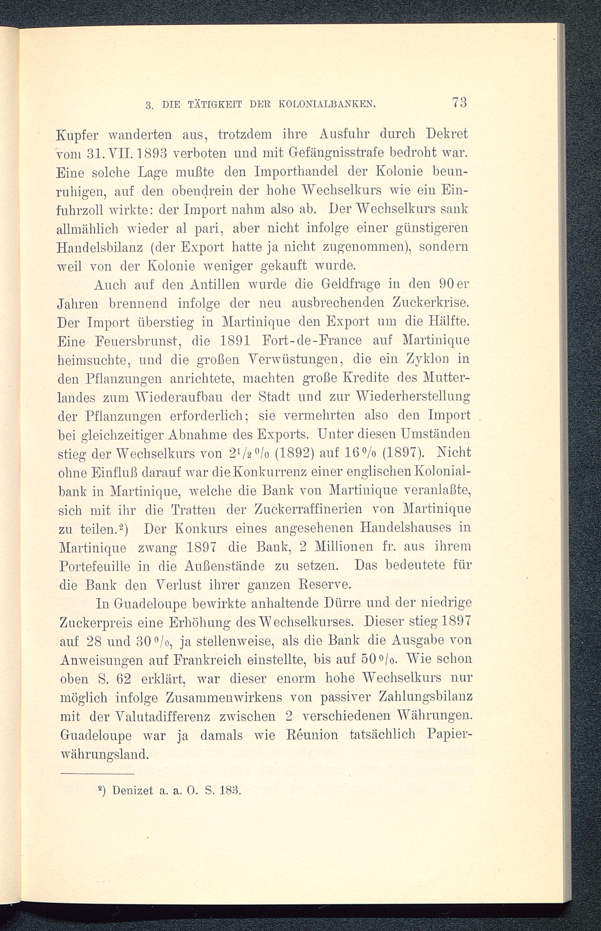 In Guadeloupe bewirkte anhaltende Dürre und der niedrigeZuckerpreis eine Erhöhung des Wechselkurses. Dieser stieg 1897auf 28 und 30°/o, ja stellenweise, als die Bank die Ausgabe vonAnweisungen auf Frankreich einstellte, bis auf 50°/o. Wie schonoben S. 62 erklärt, war dieser enorm hohe Wechselkurs nurmöglich infolge Zusammenwirkens von passiver Zahlungsbilanzmit der Valutadifferenz zwischen 2 verschiedenen Währungen.Guadeloupe war ja damals wie Reunion tatsächlich Papier-währungsland.