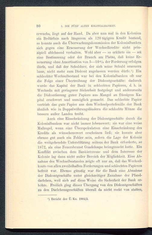 erwuchs, liegt auf der Hand. Da aber nun mal in den Kolonienein Bedürfnis nach längerem als 120 tägigem Kredit bestand,so konnte auch die Überwachungskommission der Kolonialbankensich gegen eine Erneuerung der Wechselkredite nicht prin-zipiell ablehnend verhalten. Wohl aber — so erklärte sie — seieine Bestimmung oder der Brauch am Blatze, daß keine Er-neuerung ohne Amortisation von 5—10°/o der Forderung erfolgendürfe, und daß der Schuldner, der sich seine Schuld erneuernlasse, nicht mehr zum Diskont zugelassen werden dürfe. 1 ) Einschlechter Wechselbestand war bei den Kolonialbanken oft nurdie Folge einer Übertreibung der Diskontgeschäfte: dadurchwurde das Kapital der Bank in schlechten Papieren, d. h. inWechseln mit geringerer Sicherheit festgelegt und andererseitsdie Diskontierung guter Papiere aus Mangel an flüssigem Ka-pital erschwert und unmöglich gemacht. Das schlechte Papiervertrieb das gute Papier aus dem Wechselportefeuille der Bankähnlich wie in Doppelwährungsländern die schlechte Münze diebessere außer Landes treibt.