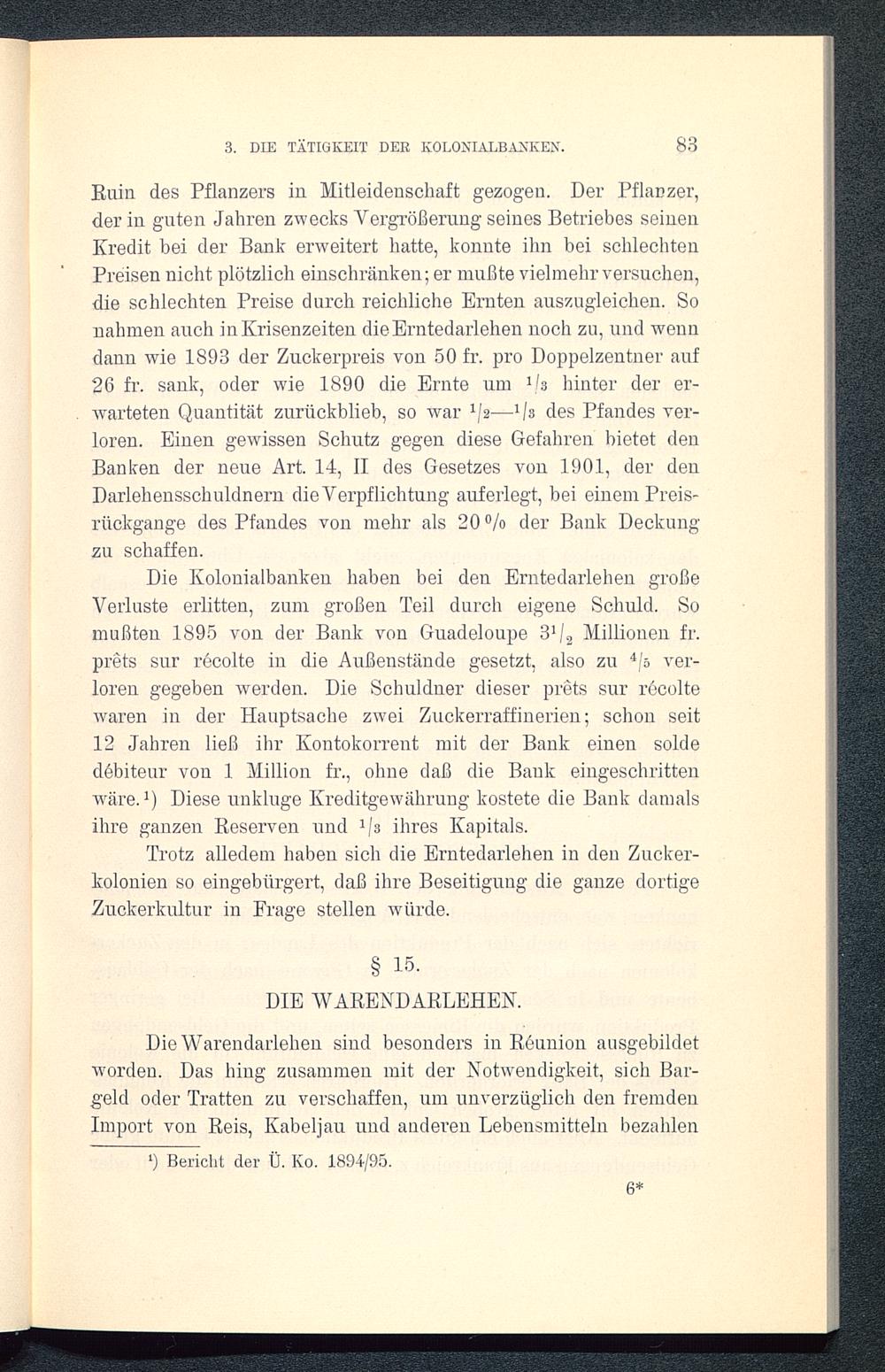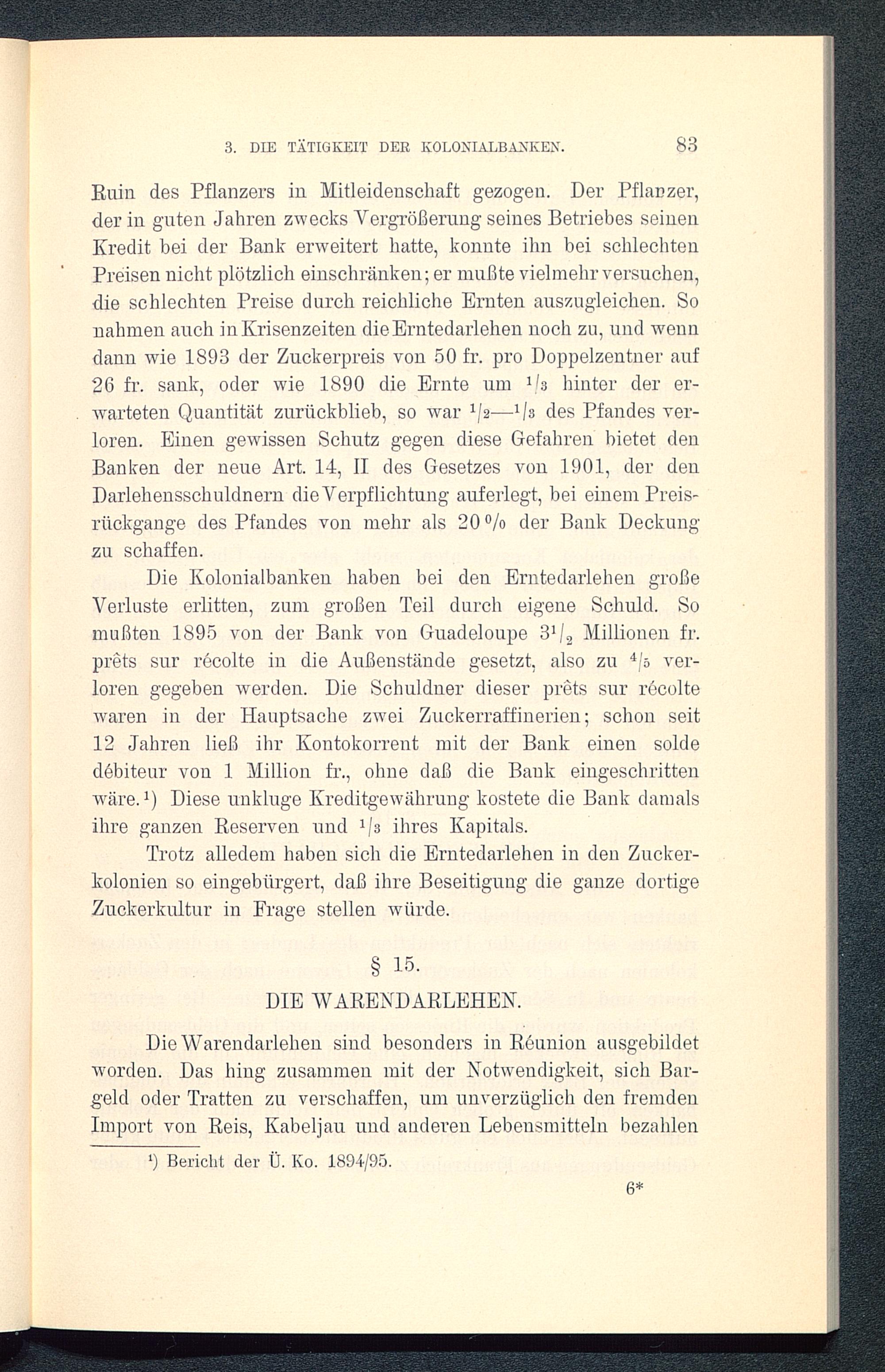 Die Kolonialbanken haben bei den Erntedarlehen großeVerluste erlitten, zum großen Teil durch eigene Schuld. Somußten 1895 von der Bank von Guadeloupe 3V 2 Millionen fr.preis sur recolte in die Außenstände gesetzt, also zu 4 /s ver-loren gegeben werden. Die Schuldner dieser prets sur recoltewaren in der Hauptsache zwei Zuckerraffinerien; schon seit12 Jahren ließ ihr Kontokorrent mit der Bank einen soldedebiteur von 1 Million fr., ohne daß die Bank eingeschrittenwäre. 1 ) Diese unkluge Kreditgewährung kostete die Bank damalsihre ganzen Keserven und 1 ja ihres Kapitals.