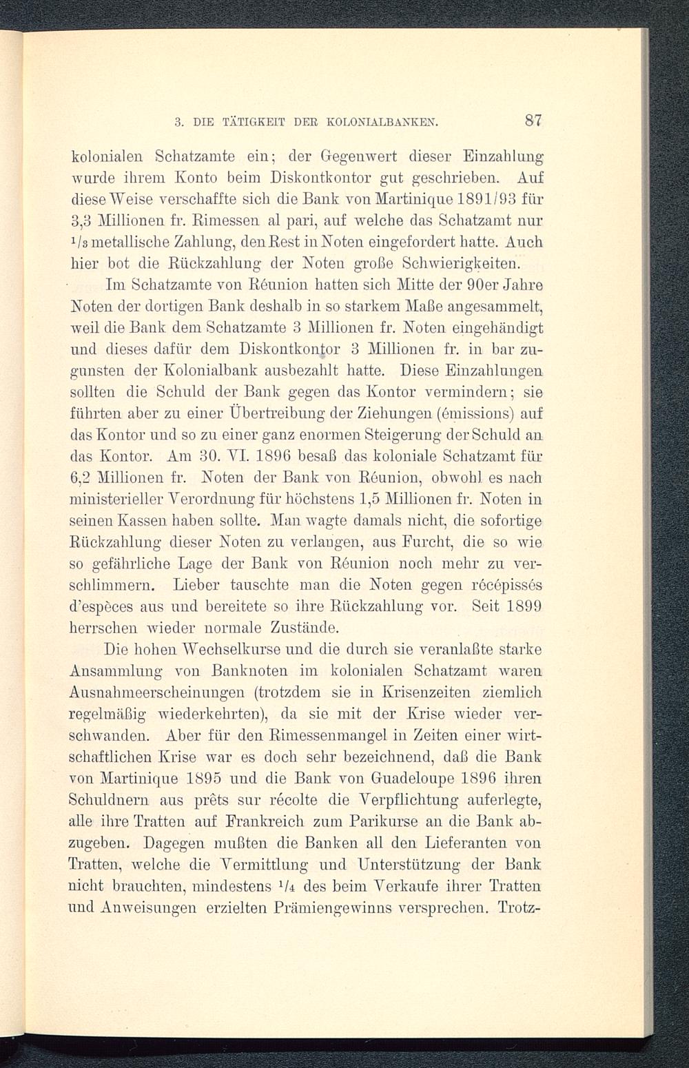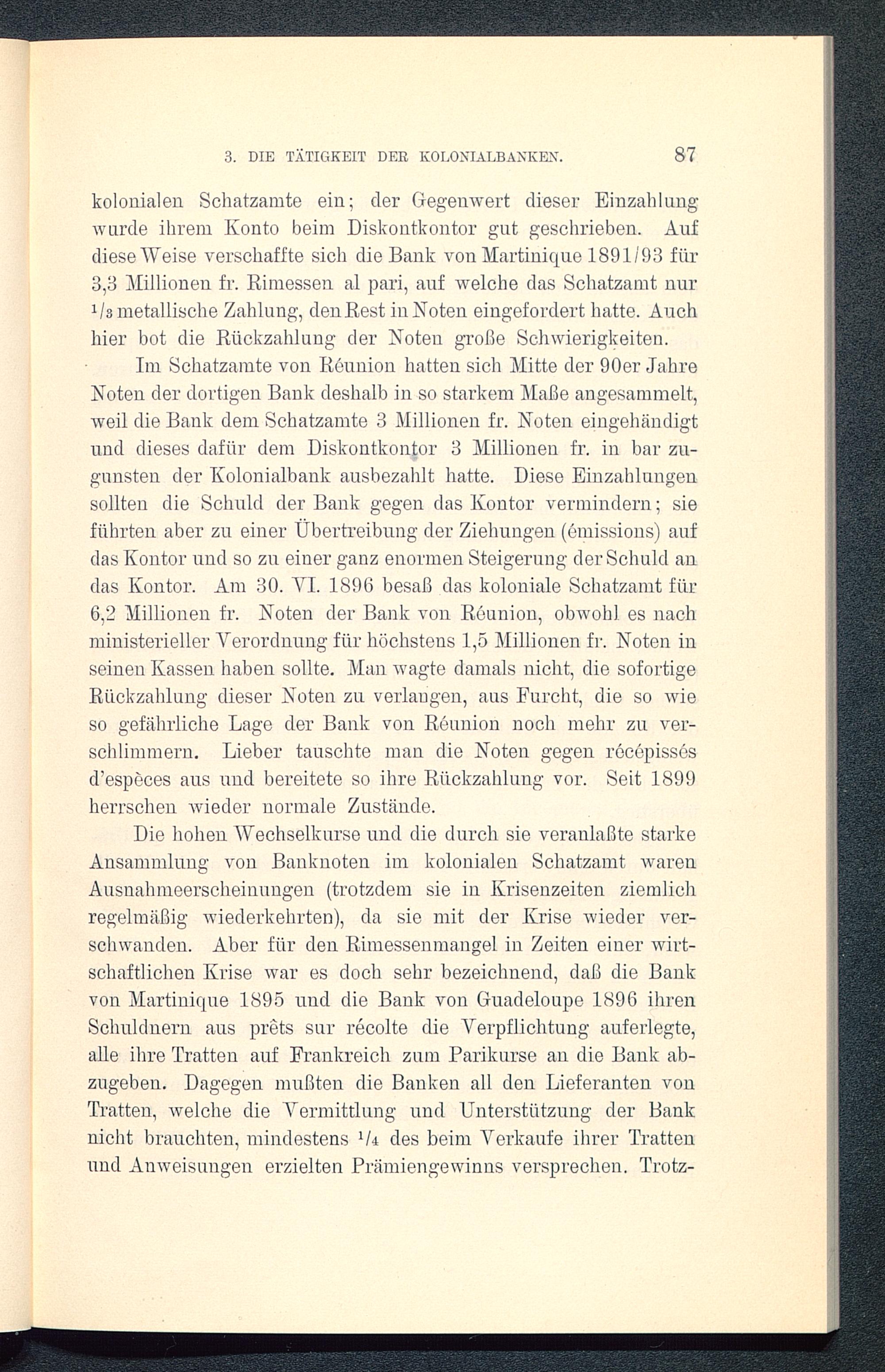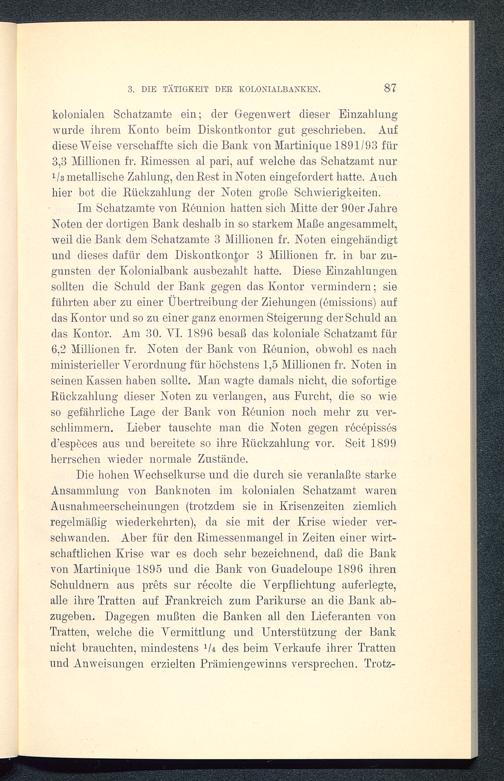 kolonialen Schatzamte ein; der Gegenwert dieser Einzahlungwurde ihrem Konto beim Diskontkontor gut geschrieben. Aufdiese Weise verschaffte sich die Bank von Martinique 1891/93 für3,3 Millionen fr. Rimessen al pari, auf welche das Schatzamt nur1 ls metallische Zahlung, den Eest in Noten eingefordert hatte. Auchhier bot die Rückzahlung der Noten große Schwierigkeiten.