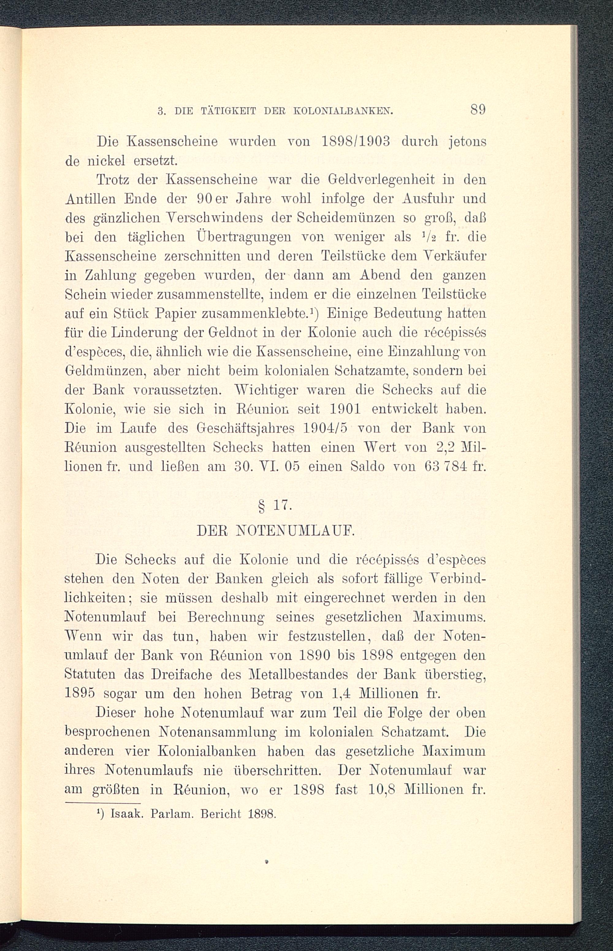 Dieser hohe Notenumlauf war zum Teil die Folge der obenbesprochenen Notenansammlung im kolonialen Schatzamt. Dieanderen vier Kolonialbanken haben das gesetzliche Maximumihres Notenumlaufs nie überschritten. Der Notenumlauf waram größten in Reunion, wo er 189S fast 10,8 Millionen fr.