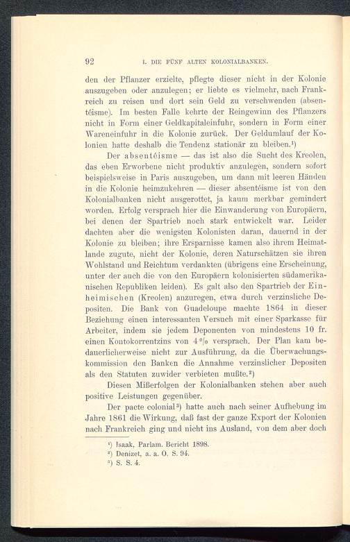 Der absentöisme — das ist also die Sucht des Kreolen,das eben Erworbene nicht produktiv anzulegen, sondern sofortbeispielsweise in Paris auszugeben, um dann mit leeren Händenin die Kolonie heimzukehren — dieser absenteisme ist von denKolonialbanken nicht ausgerottet, ja kaum merkbar gemindertworden. Erfolg versprach hier die Einwanderung vou Europäern,bei denen der Spartrieb noch stark entwickelt war. Leiderdachten aber die wenigsten Kolonisten daran, dauernd in derKolonie zu bleiben; ihre Ersparnisse kamen also ihrem Heimat-lande zugute, nicht der Kolonie, deren Naturschätzen sie ihrenWohlstand und Reichtum verdankten (übrigens eine Erscheinung,unter der auch die von den Europäern kolonisierten südamerika-nischen Republiken leiden). Es galt also den Spartrieb der Ein-heimischen (Kreolen) anzuregen, etwa durch verzinsliche De-positen. Die Bank von Guadeloupe machte 1S64 in dieserBeziehung einen interessanten Versuch mit einer Sparkasse fürArbeiter, indem sie jedem Deponenten von mindestens 10 fr.einen Kontokorrentzins von 4 °/o versprach. Der Plan kam be-dauerlicherweise nicht zur Ausführung, da die Überwachungs-kommission den Banken die Annahme verzinslicher Depositenals den Statuten zuwider verbieten mußte. 2 )
