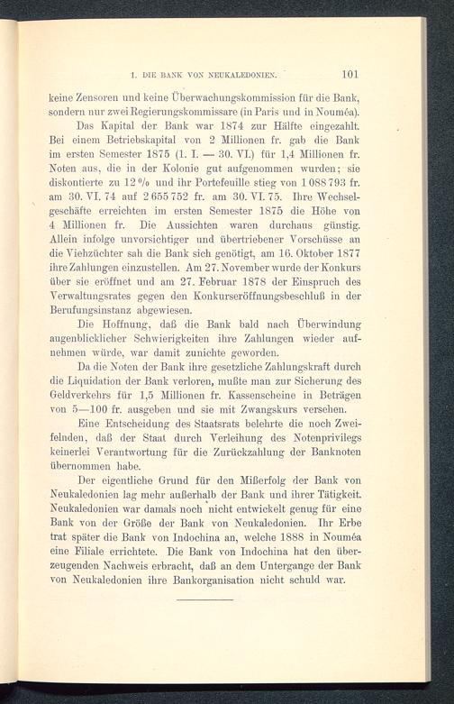 Der eigentliche Grund für den Mißerfolg der Bank vonNeukaledonien lag mehr außerhalb der Bank und ihrer Tätigkeit.Neukaledonien war damals noch nicht entwickelt genug für eineBank von der Größe der Bank von Neukaledonien . Ihr Erbetrat später die Bank von Indochina an, welche 1888 in Noumea eine Filiale errichtete. Die Bank von Indochina hat den über-zeugenden Nachweis erbracht, daß an dem Untergange der Bankvon Neukaledonien ihre Bankorganisation nicht schuld war.
