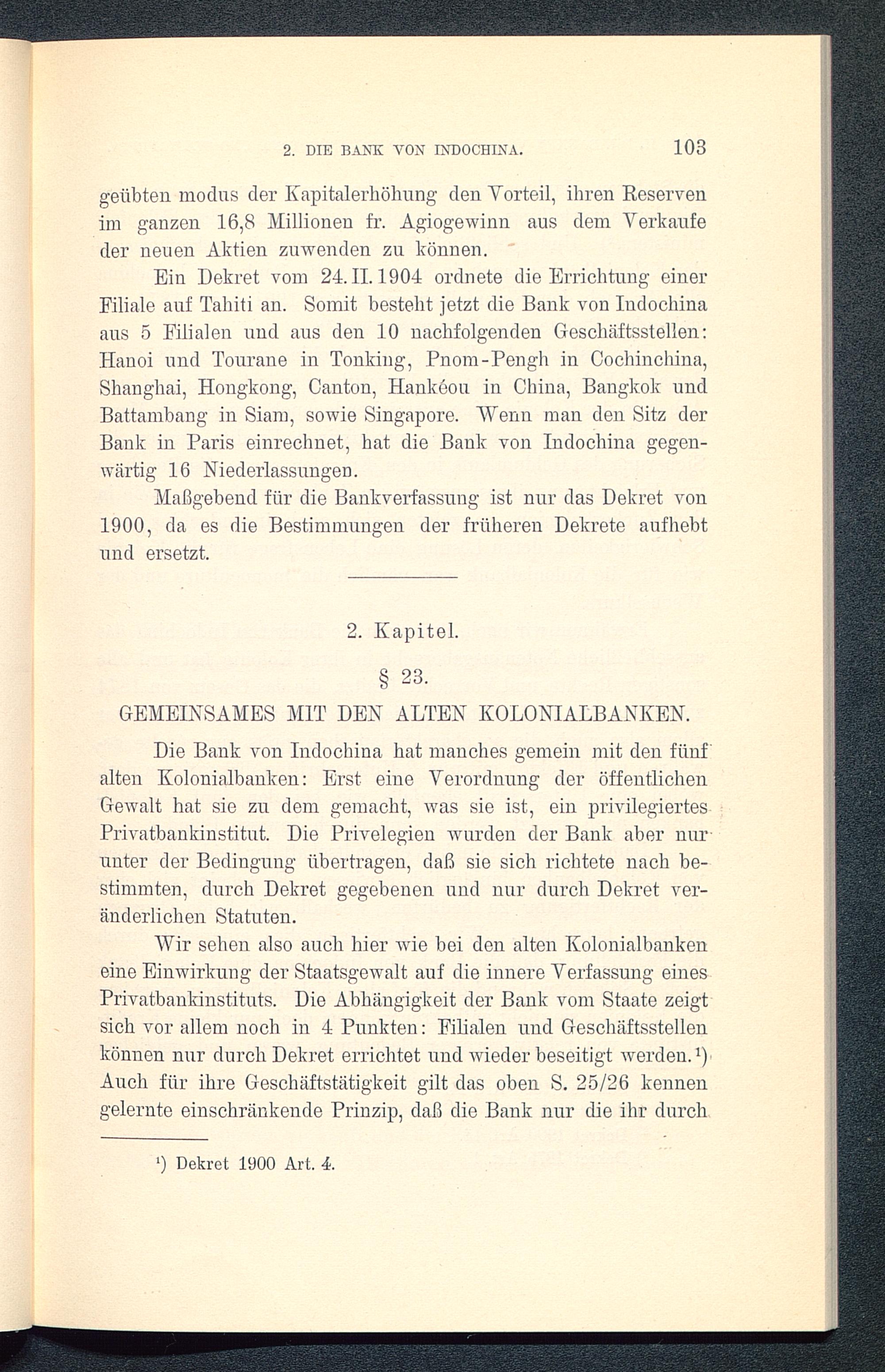 Die Bank von Indochina hat manches gemein mit den fünfalten Kolonialbanken: Erst eine Verordnung der öffentlichenGewalt hat sie zu dem gemacht, was sie ist, ein privilegiertesPrivatbankinstitut. Die Privelegien wurden der Bank aber nurunter der Bedingung übertragen, daß sie sich richtete nach be-stimmten, durch Dekret gegebenen und nur durch Dekret ver-änderlichen Statuten.