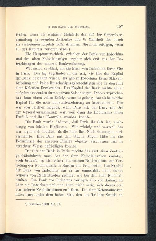 Wie schon erwähnt, hat die Bank von Indocbina ihren Sitzin Paris . Das lag begründet in der Art, wie hier das Kapitalder Bank beschafft wurde. Es gab in Iudochina keine Sklaven-befreiung und keine Entschädigungsberechtigten wie in den fünfalten Kolonien Frankreichs. Das Kapital der Bank mußte daheraufgebracht werden durch private Zeichnungen. Diese versprachennur dann einen vollen Erfolg, wenn es gelang, das einheimischeKapital für die neue Bankunternehmung zu interessieren. Daswar aber leichter möglich, wenn Paris Sitz der Bank und Ortder Generalversammlung war, weil dann die Hochfinanz ihrenEinfluß und ihre Kontrolle ausüben konnte.