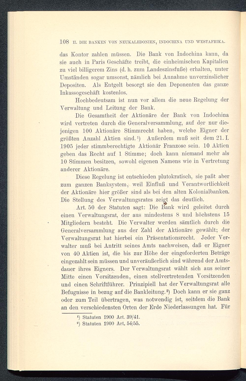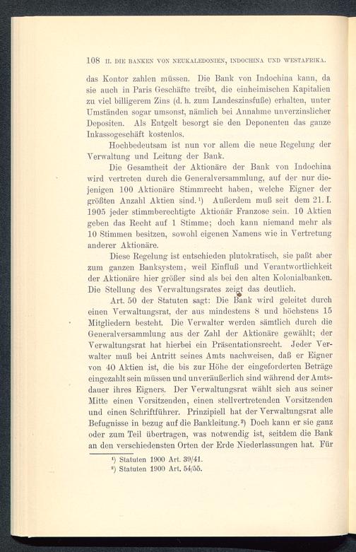 Diese Kegelung ist entschieden plutokratisch, sie paßt aberzum ganzen Banksystem, weil Einfluß und Verantwortlichkeitder Aktionäre hier größer sind als bei den alten Kolonialbanken.Die Stellung des Verwaltungsrates zeiget das deutlich.