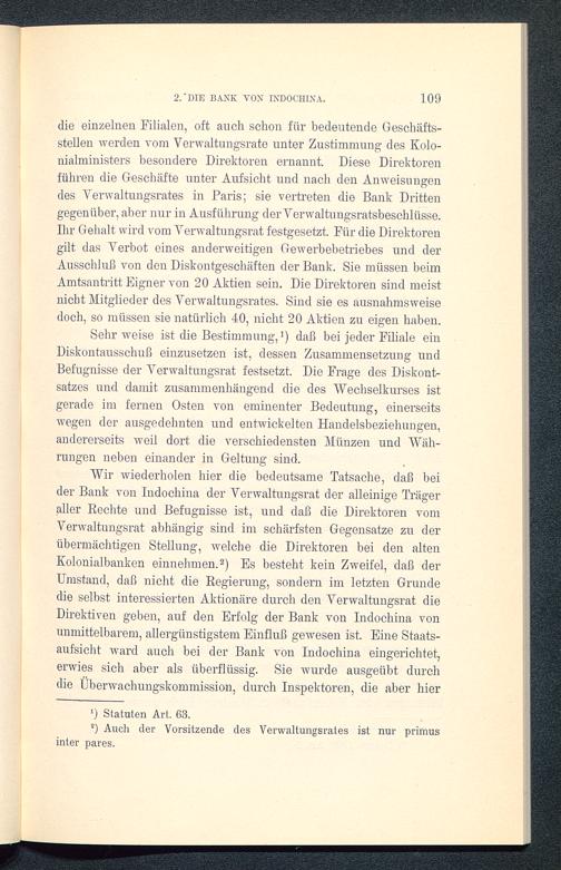 Wir wiederholen hier die bedeutsame Tatsache, daß beider Bank von Indochina der Verwaltungsrat der alleinige Trägeraller Rechte und Befugnisse ist, und daß die Direktoren vomVerwaltungsrat abhängig sind im schärfsten Gegensatze zu derübermächtigen Stellung, welche die Direktoren bei den altenKolonialbanken einnehmen. 2 ) Es besteht kein Zweifel, daß derUmstand, daß nicht die Regierung, sondern im letzten Grundedie selbst interessierten Aktionäre durch den Verwaltungsrat dieDirektiven geben, auf den Erfolg der Bank von Indochina vonunmittelbarem, allergünstigstem Einfluß gewesen ist. Eine Staats-aufsicht ward auch bei der Bank von Indochina eingerichtet,erwies sich aber als überflüssig. Sie wurde ausgeübt durchdie Uberwachungskommission, durch Inspektoren, die aber hier