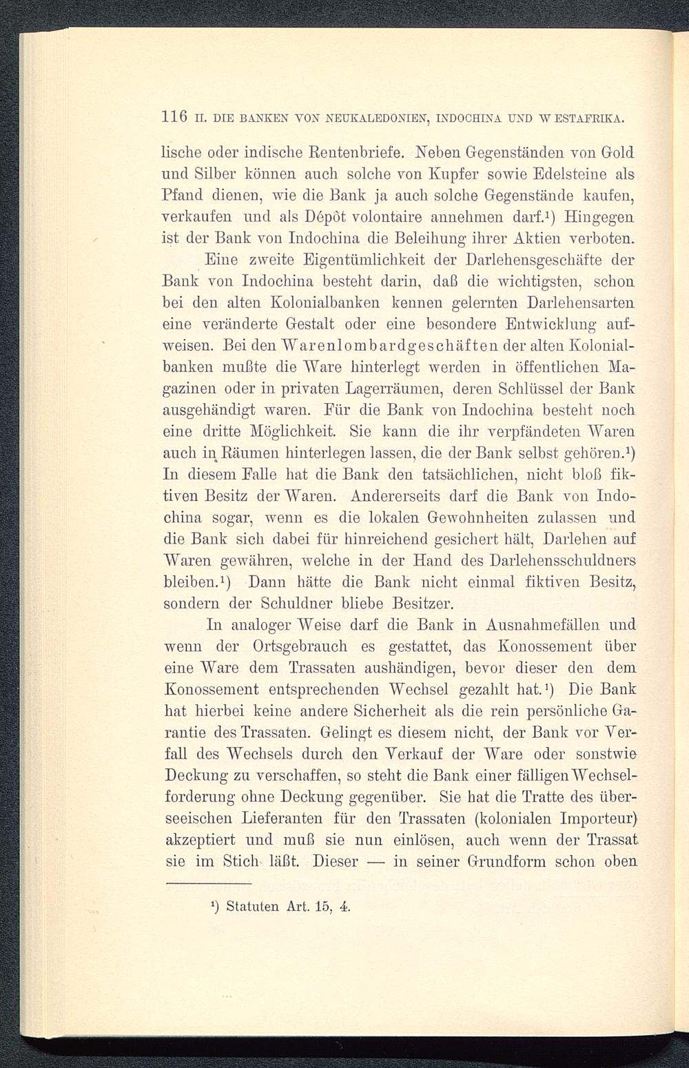 lische oder indische Rentenbriefe. Neben Gegenständen von Goldund Silber können auch solche von Kupfer sowie Edelsteine alsPfand dienen, wie die Bank ja auch solche Gegenstände kaufen,verkaufen und als Depot volontaire annehmen darf. 1 ) Hingegenist der Bank von Indochina die Beleihung ihrer Aktien verboten.