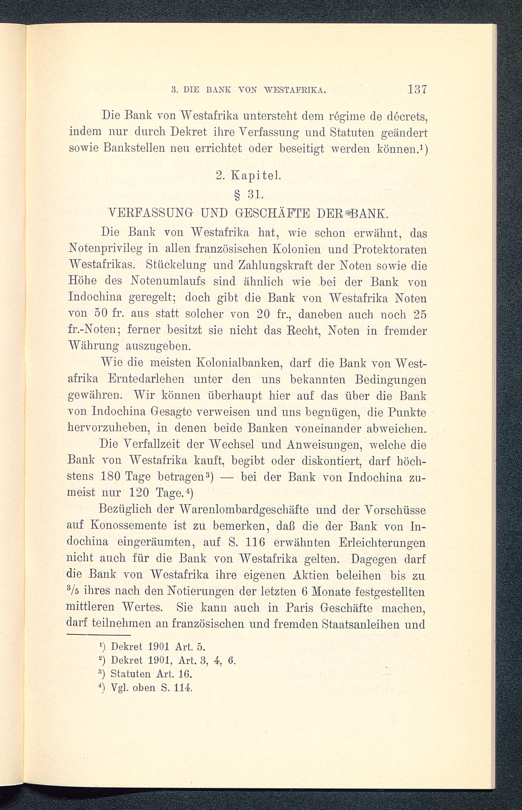 Die Bank von Westafrika untersteht dem regime de decrets,indem nur durch Dekret ihre Verfassung und Statuten geändertsowie Bankstellen neu errichtet oder beseitigt werden können. 1 )