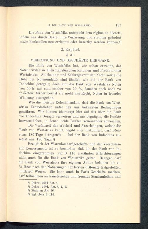 Bezüglich der Warenlombardgeschäfte und der Vorschüsseauf Konossemente ist zu bemerken, daß die der Bank von In-dochina eingeräumten, auf S. 116 erwähnten Erleichterungennicht auch für die Bank von Westafrika gelten. Dagegen darfdie Bank von Westafrika ihre eigenen Aktien beleihen bis zu3 /s ihres nach den Notierungen der letzten 6 Monate festgestelltenmittleren Wertes. Sie kann auch in Paris Geschäfte machen,darf teilnehmen an französischen und fremden Staatsanleihen und