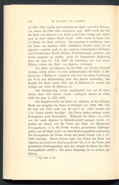 Die Bank von Algerien ist mit Hilfe des Staates errichtetworden, indem dieser von dem Anfangskapital der Bank (3 Mil-lionen fr.) 1 Million fr. vorschoß und sich nur deren Verzinsung(zu 3 %) und Rückzahlung nach drei Jahren ausbedang. DasKapital der Bank wurde 1861 auf 10 Millionen fr. erhöht undbeträgt seit 1880 20 Millionen fr.
